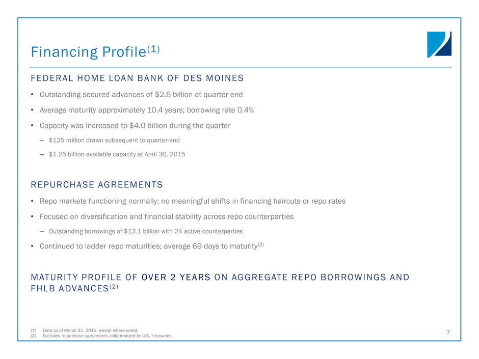 EXPENSE RATIO Financial Summary 6 Q1-2015 FINANCIAL HIGHLIGHTS CORE EARNINGS (1) (1) See footnote 2 on slide 3 for Core Earnings definition. For a reconciliation of GAAP to non-GAAP financials, refer to Appendix slide 16. (2) Implied debt-to-equity is calculated after including net long or short TBA position. As of March 31, 2015, the net TBA position was short $2.5 billion notional. • Core Earnings of $0.26 per share; annualized return on average equity of 9.2%(1) • Results impacted by: ― Decreased swap expense due to lower average swap notional during the quarter; added to swap notional in March, which will drive higher swap costs in future periods ― Modestly higher leverage on Agency and non-Agency portfolios; implied debt-to-equity(2) 2.8x at March 31, 2015 decreased due to short TBA position ― Operating expense ratio consistent with expectations; ratio likely to increase as Commercial strategy is built • Commercial real estate loans to be reported at amortized cost; evaluated for impairment on a quarterly basis 1.5% 1.5% 1.2% 1.5% 1.6% 0.0% 0.5% 1.0% 1.5% 2.0% Q1-2014 Q2-2014 Q3-2014 Q4-2014 Q1-2015 Other Operating Expenses as % of Average Equity $88.2 $89.7 $82.8 $83.1 $94.1 $0.24 $0.24 $0.23 $0.23 $0.26 $0.00 $0.10 $0.20 $0.30 $0.40 $0.50 $60.0 $80.0 $100.0 Q1-2014 Q2-2014 Q3-2014 Q4-2014 Q1-2015 Core Earnings ($M) Core EPS
