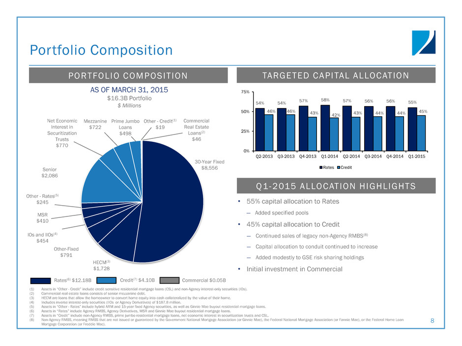 Financing Profile(1) 7 FEDERAL HOME LOAN BANK OF DES MOINES • Outstanding secured advances of $2.6 billion at quarter-end • Average maturity approximately 10.4 years; borrowing rate 0.4% • Capacity was increased to $4.0 billion during the quarter ― $125 million drawn subsequent to quarter-end ― $1.25 billion available capacity at April 30, 2015 REPURCHASE AGREEMENTS • Repo markets functioning normally; no meaningful shifts in financing haircuts or repo rates • Focused on diversification and financial stability across repo counterparties ― Outstanding borrowings of $13.1 billion with 24 active counterparties • Continued to ladder repo maturities; average 69 days to maturity(2) MATURIT Y PROFILE OF OVER 2 YEARS ON AGGREGATE REPO BORROWINGS AND FHLB ADVANCES (2) (1) Data as of March 31, 2015, except where noted. (2) Excludes repurchase agreements collateralized by U.S. Treasuries.