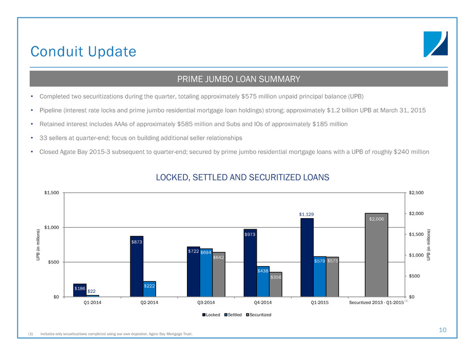 Portfolio Performance and Hedging 9 Q 1 - 2 015 P E R FO R M A NC E H I G H L I G H TS (1) Assets in “Rates” include Agency RMBS, IIOs (or Agency Derivatives), MSR and Ginnie Mae buyout residential mortgage loans. (2) Assets in “Credit” include non-Agency RMBS, prime jumbo residential mortgage loans, net economic interest in securitization trusts and CSL. (3) Represents estimated percentage change in equity value for theoretical +100 bps parallel shift in interest rates at period end. Change in equity value is total net asset change. (4) “Legacy” non-Agency RMBS includes non-Agency bonds issued up to and including 2009. “New issue” non-Agency RMBS includes bonds issued after 2009. (5) Cost of funds includes interest spread expense associated with the portfolio's interest rate swaps. R AT E S (1 ) • Strong MSR performance; yield of 9.8% in quarter C R E D I T (2 ) • New issue non-Agency yield up 20 basis points; purchased higher- yielding bonds from GSE credit risk sharing deals H E D G I N G • Positioned for Federal Reserve to move interest rates higher on a measured basis • Maintain optional protection with swaptions and other hedging instruments should a dramatic change in rates occur Q 1 - 2 015 N E T I N T E R E ST Y I E L D Three Months Ended Dec. 31, 2014 Mar. 31, 2015 Annualized portfolio yield during the quarter 4.46% 4.40% Rates(1) Agency RMBS, Agency derivatives and MSR 3.7% 3.8% Ginnie Mae buyout residential mortgage loans 1.7% 1.6% Credit(2) Non-Agency RMBS, legacy(4) 8.8% 8.5% Non-Agency RMBS, new issue(4) 3.7% 3.9% Net economic interest in securitization trusts 4.7% 4.6% Prime jumbo residential mortgage loans 4.0% 3.9% Credit sensitive loans (CSL) 5.8% 5.4% Commercial n/a 7.0% Annualized cost of funds on average repurchase and advance balance during the quarter(5) 1.55% 1.33% Annualized interest rate spread for aggregate portfolio during the quarter 2.91% 3.07% BV E X P O S U R E TO + 100BP S C H A N G E I N R AT E S (3 ) 1.3% (2.0%) (0.1%) (3.1%) (2.6%) (5.0%) (2.5%) – 2.5% 5.0% Q1-2014 Q2-2014 Q3-2014 Q4-2014 Q1-2015