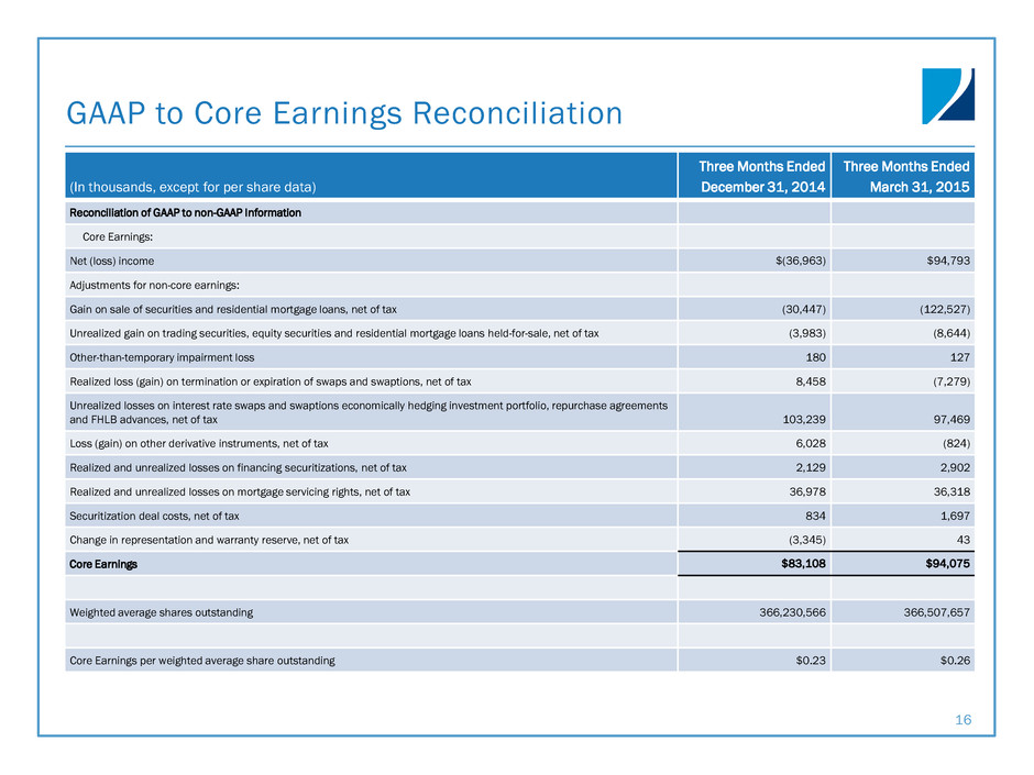 GAAP to Core Earnings Reconciliation (In thousands, except for per share data) Three Months Ended December 31, 2014 Three Months Ended March 31, 2015 Reconciliation of GAAP to non-GAAP Information Core Earnings: Net (loss) income $(36,963) $94,793 Adjustments for non-core earnings: Gain on sale of securities and residential mortgage loans, net of tax (30,447) (122,527) Unrealized gain on trading securities, equity securities and residential mortgage loans held-for-sale, net of tax (3,983) (8,644) Other-than-temporary impairment loss 180 127 Realized loss (gain) on termination or expiration of swaps and swaptions, net of tax 8,458 (7,279) Unrealized losses on interest rate swaps and swaptions economically hedging investment portfolio, repurchase agreements and FHLB advances, net of tax 103,239 97,469 Loss (gain) on other derivative instruments, net of tax 6,028 (824) Realized and unrealized losses on financing securitizations, net of tax 2,129 2,902 Realized and unrealized losses on mortgage servicing rights, net of tax 36,978 36,318 Securitization deal costs, net of tax 834 1,697 Change in representation and warranty reserve, net of tax (3,345) 43 Core Earnings $83,108 $94,075 Weighted average shares outstanding 366,230,566 366,507,657 Core Earnings per weighted average share outstanding $0.23 $0.26 16