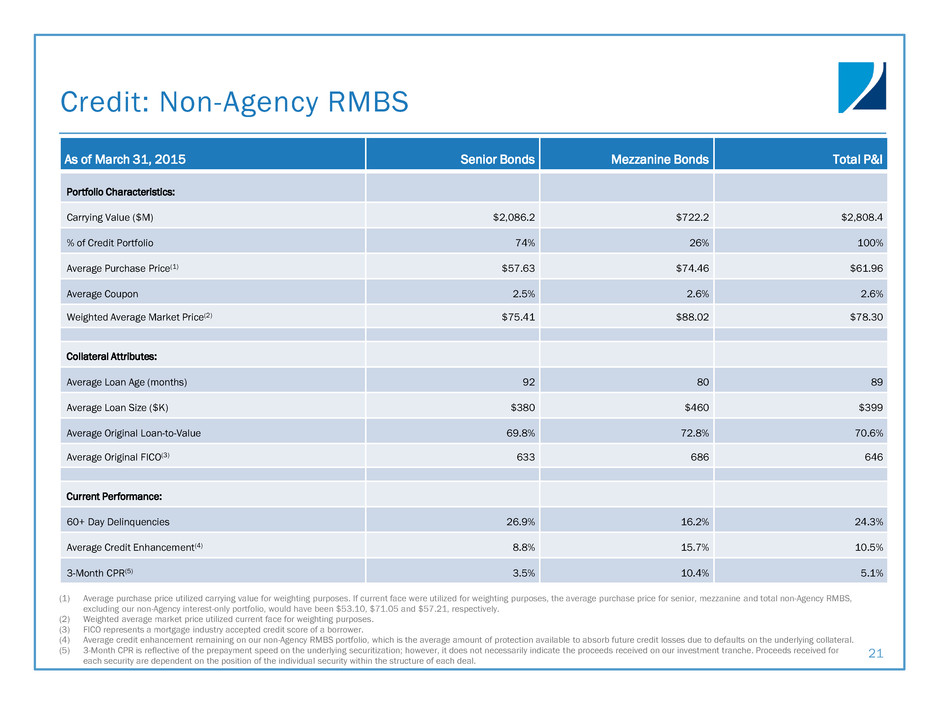 Credit: Non-Agency RMBS Metrics 20 NON-AGENCY PORTFOLIO COMPOSITION NON-AGENCY PORTFOLIO YIELDS AND METRICS (1) Weighted average cost basis includes RMBS principal and interest securities only. Average purchase price utilized carrying value for weighting purposes. If current face were utilized for weighting purposes, total non-Agency RMBS excluding the company’s non-Agency interest-only portfolio would have been $57.21 at March 31, 2015. Portfolio Yield Realized Q4-2014 At Dec. 31, 2014 Realized Q1-2015 At Mar. 31, 2015 Non-Agency yield 8.1% 8.1% 7.9% 7.8% Repo and FHLB costs 1.8% 1.7% 1.8% 1.9% Swap costs 0.8% 0.6% 0.1% 0.0% Net interest spread 5.5% 5.8% 6.0% 5.9% NON-AGENCY RMBS CPR Non-Agency: Loan Type Q4-2014 Q1-2015 Sub-Prime 73% 68% Prime 13% 15% Option-ARM 7% 7% Other 4% 6% Alt-A 3% 4% Portfolio Metrics Q4-2014 Q1-2015 Weighted average 3-month CPR 4.2% 5.1% Weighted average cost basis(1) $59.2 $62.0 3.4% 3.6% 4.1% 4.2% 5.1% 0.0% 4.0% 8.0% Q1-2014 Q2-2014 Q3-2014 Q4-2014 Q1-2015 Non-Agency RMBS CPR