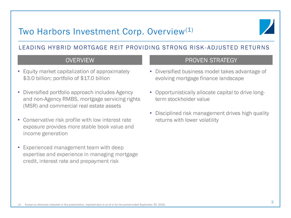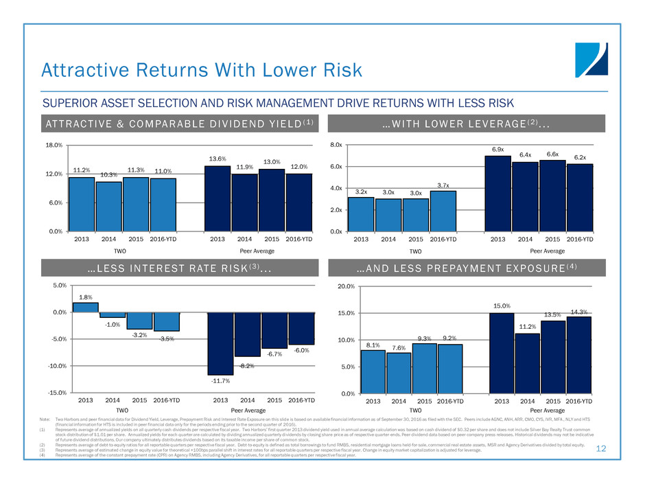 (1) Two Harbors’ total stockholder return is calculated for the period October 29, 2009 through September 30, 2016. Total stockholder return is defined as stock price appreciation including dividends. Source: Bloomberg.