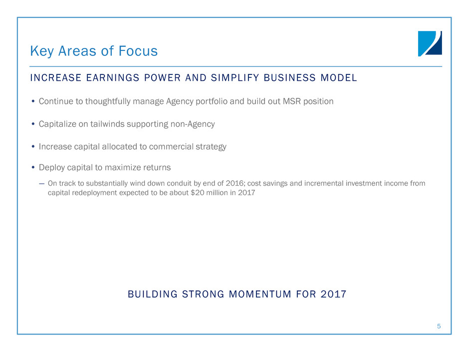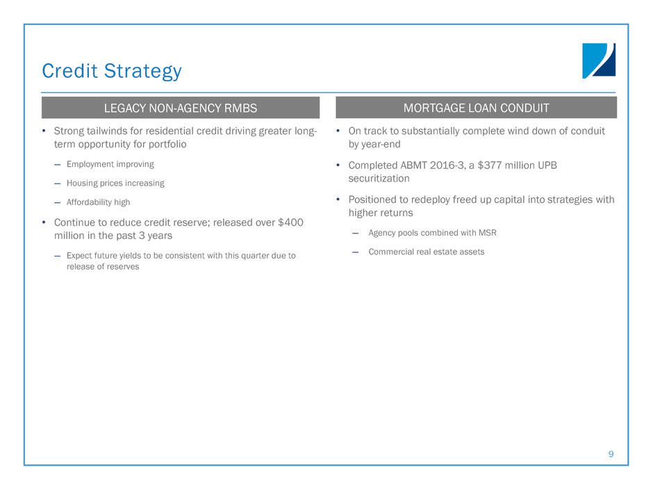 ― On track to substantially wind down conduit by end of 2016; cost savings and incremental investment income from