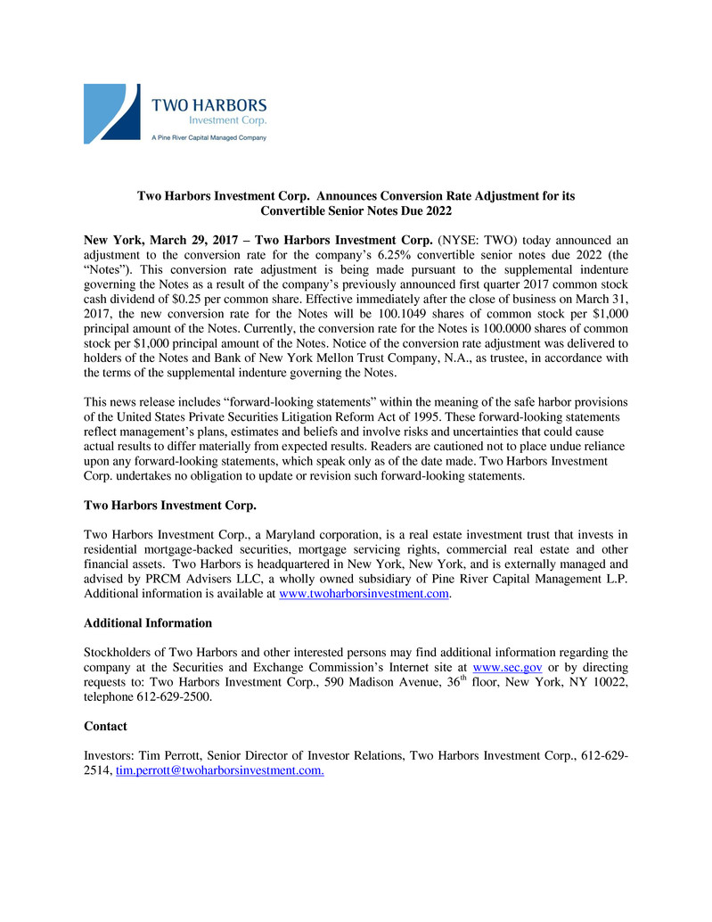 New York, March 29, 2017 – Two Harbors Investment Corp. (NYSE: TWO) today announced an