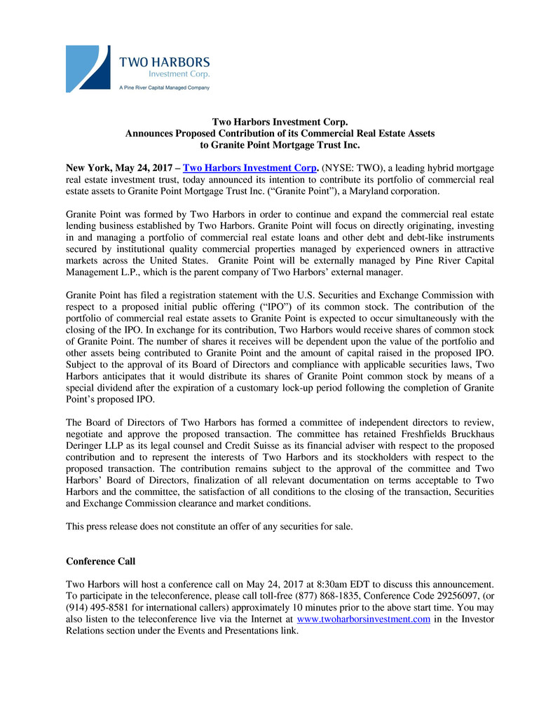 New York, May 24, 2017 – Two Harbors Investment Corp. (NYSE: TWO), a leading hybrid mortgage