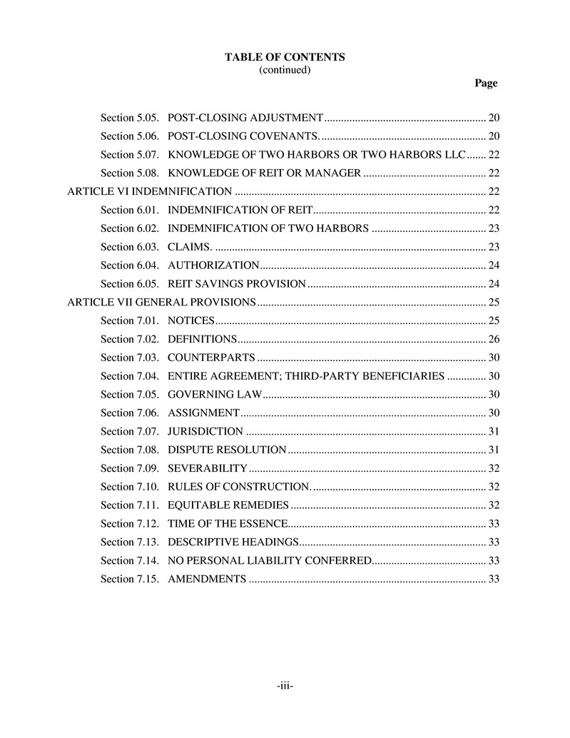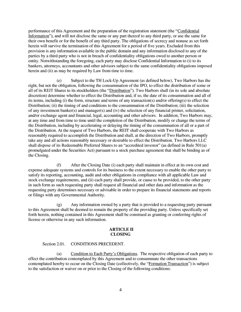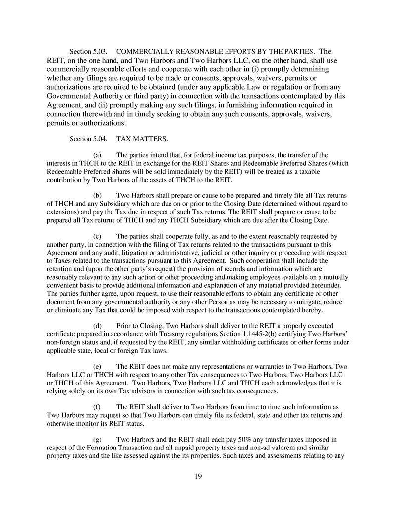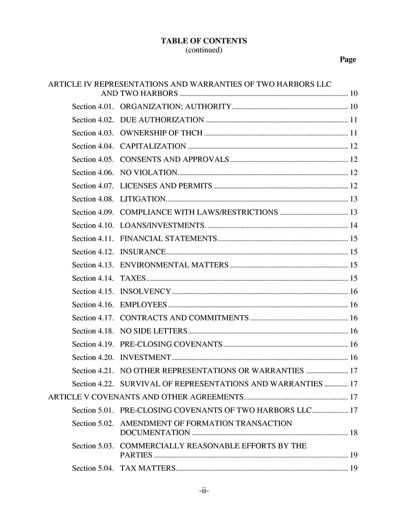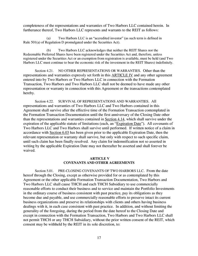 Section 5.01. PRE-CLOSING COVENANTS OF TWO HARBORS LLC .................. 17