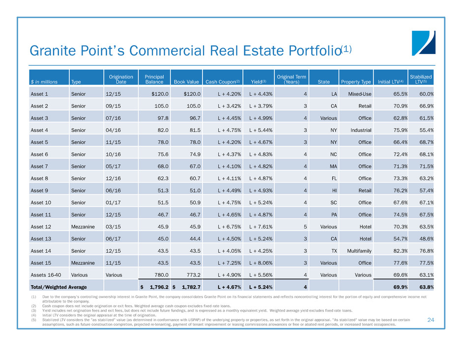 • Formed Granite Point Mortgage Trust Inc. (“Granite Point”) and contributed portfolio of commercial