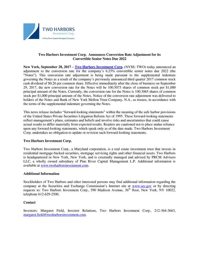 New York, September 28, 2017 – Two Harbors Investment Corp. (NYSE: TWO) today announced an