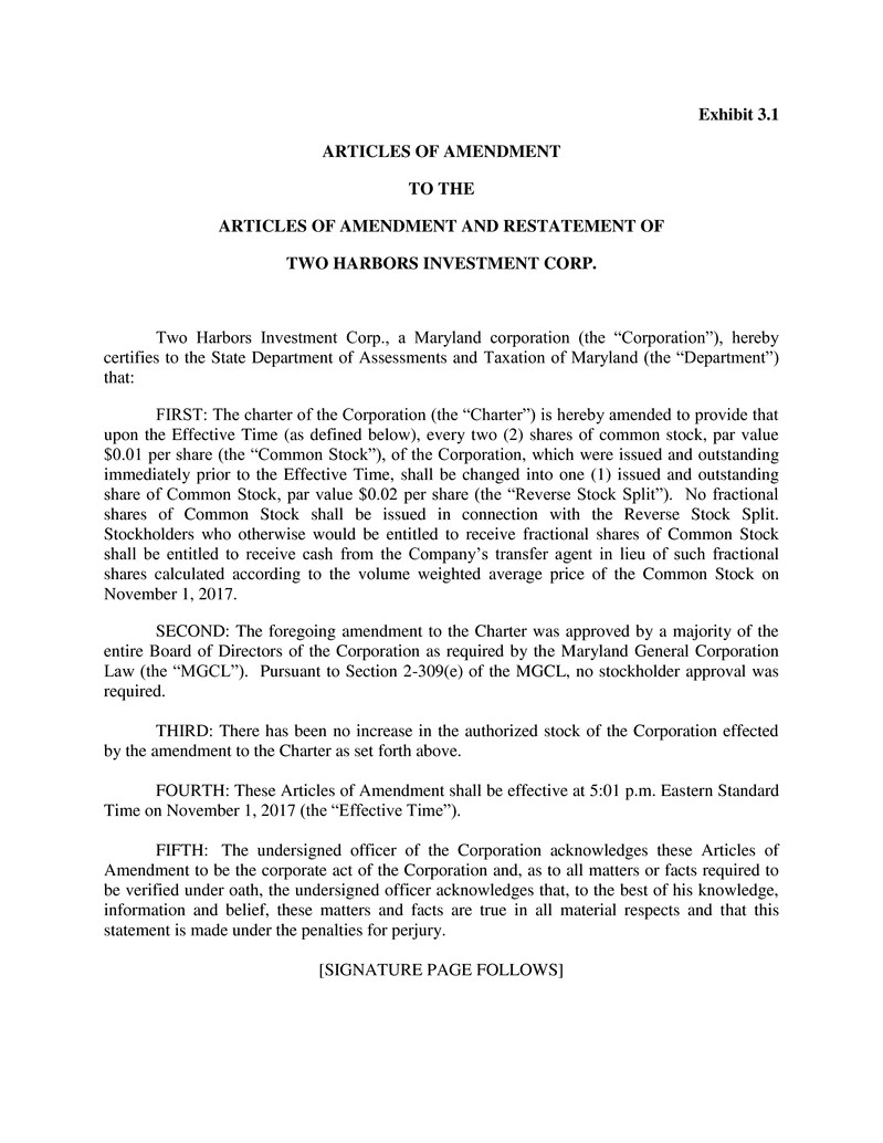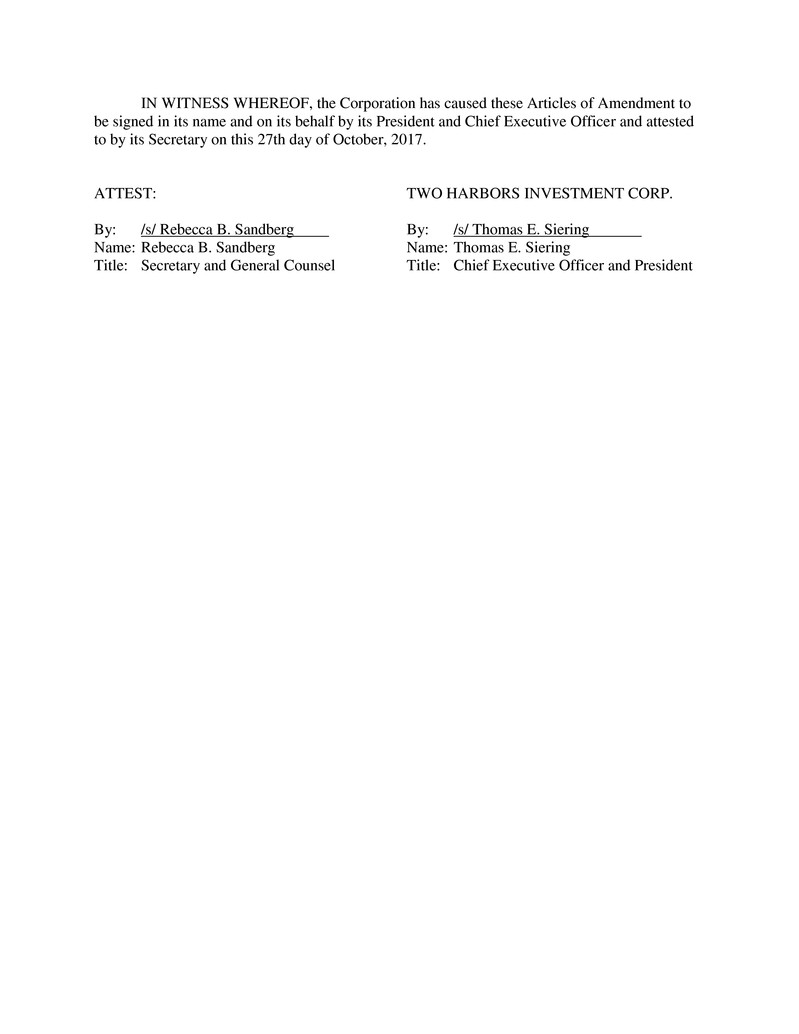 Two Harbors Investment Corp., a Maryland corporation (the “Corporation”), hereby