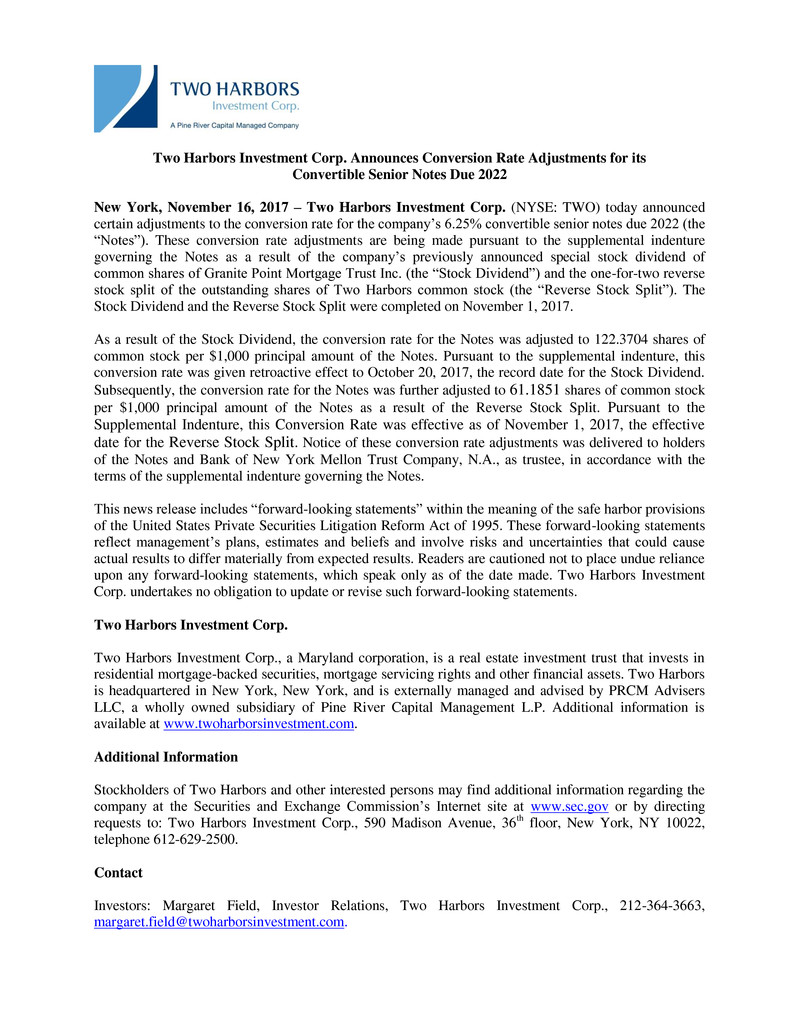 New York, November 16, 2017 – Two Harbors Investment Corp. (NYSE: TWO) today announced