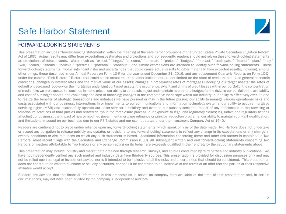 Readers are cautioned not to place undue reliance upon any forward-looking statements, which speak only as of the date made. Two Harbors does not undertake
