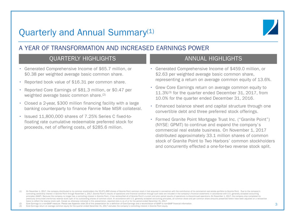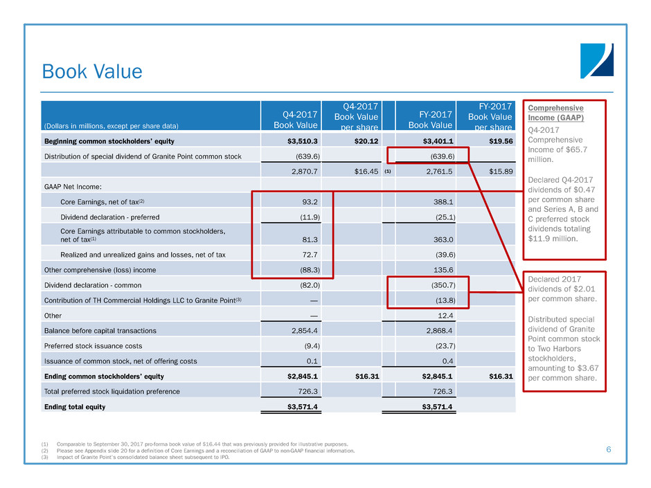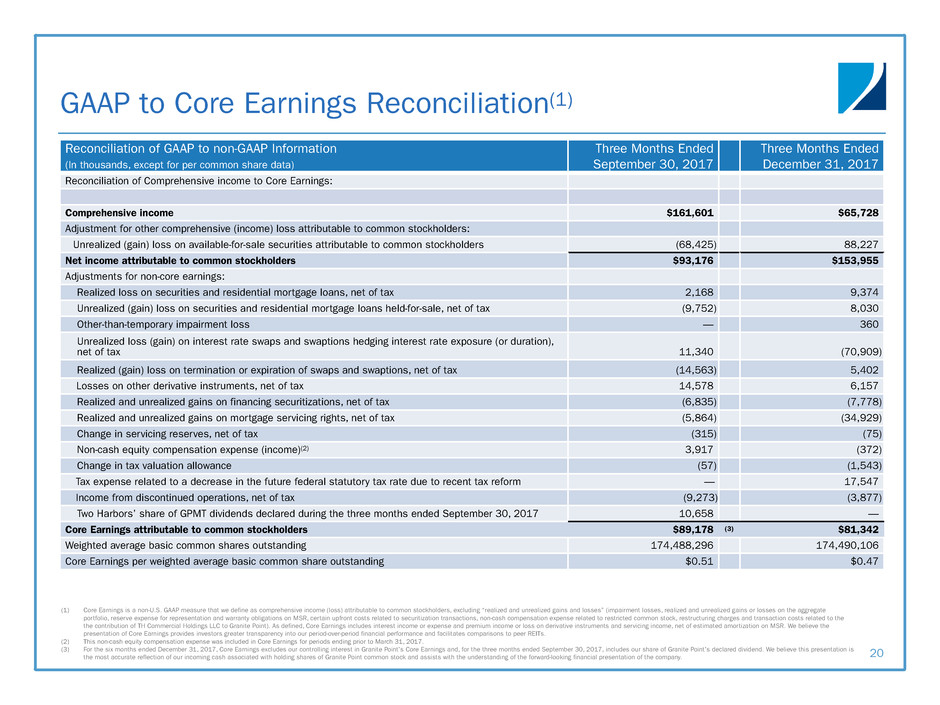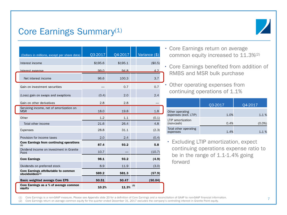 (3) Core Earnings return on average common equity for the quarter ended December 31, 2017 excludes the company’s controlling interest in Granite Point equity.