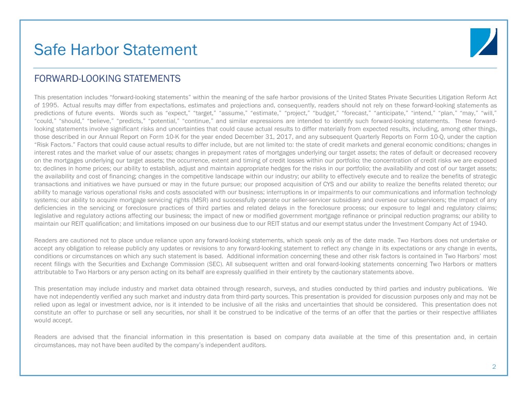 Safe Harbor Statement FORWARD-LOOKING STATEMENTS This presentation includes “forward-looking statements” within the meaning of the safe harbor provisions of the United States Private Securities Litigation Reform Act of 1995. Actual results may differ from expectations, estimates and projections and, consequently, readers should not rely on these forward-looking statements as predictions of future events. Words such as “expect,” “target,” “assume,” “estimate,” “project,” “budget,” “forecast,” “anticipate,” “intend,” “plan,” “may,” “will,” “could,” “should,” “believe,” “predicts,” “potential,” “continue,” and similar expressions are intended to identify such forward-looking statements. These forward- looking statements involve significant risks and uncertainties that could cause actual results to differ materially from expected results, including, among other things, those described in our Annual Report on Form 10-K for the year ended December 31, 2017, and any subsequent Quarterly Reports on Form 10-Q, under the caption “Risk Factors.” Factors that could cause actual results to differ include, but are not limited to: the state of credit markets and general economic conditions; changes in interest rates and the market value of our assets; changes in prepayment rates of mortgages underlying our target assets; the rates of default or decreased recovery on the mortgages underlying our target assets; the occurrence, extent and timing of credit losses within our portfolio; the concentration of credit risks we are exposed to; declines in home prices; our ability to establish, adjust and maintain appropriate hedges for the risks in our portfolio; the availability and cost of our target assets; the availability and cost of financing; changes in the competitive landscape within our industry; our ability to effectively execute and to realize the benefits of strategic transactions and initiatives we have pursued or may in the future pursue; our proposed acquisition of CYS and our ability to realize the benefits related thereto; our ability to manage various operational risks and costs associated with our business; interruptions in or impairments to our communications and information technology systems; our ability to acquire mortgage servicing rights (MSR) and successfully operate our seller-servicer subsidiary and oversee our subservicers; the impact of any deficiencies in the servicing or foreclosure practices of third parties and related delays in the foreclosure process; our exposure to legal and regulatory claims; legislative and regulatory actions affecting our business; the impact of new or modified government mortgage refinance or principal reduction programs; our ability to maintain our REIT qualification; and limitations imposed on our business due to our REIT status and our exempt status under the Investment Company Act of 1940. Readers are cautioned not to place undue reliance upon any forward-looking statements, which speak only as of the date made. Two Harbors does not undertake or accept any obligation to release publicly any updates or revisions to any forward-looking statement to reflect any change in its expectations or any change in events, conditions or circumstances on which any such statement is based. Additional information concerning these and other risk factors is contained in Two Harbors’ most recent filings with the Securities and Exchange Commission (SEC). All subsequent written and oral forward-looking statements concerning Two Harbors or matters attributable to Two Harbors or any person acting on its behalf are expressly qualified in their entirety by the cautionary statements above. This presentation may include industry and market data obtained through research, surveys, and studies conducted by third parties and industry publications. We have not independently verified any such market and industry data from third-party sources. This presentation is provided for discussion purposes only and may not be relied upon as legal or investment advice, nor is it intended to be inclusive of all the risks and uncertainties that should be considered. This presentation does not constitute an offer to purchase or sell any securities, nor shall it be construed to be indicative of the terms of an offer that the parties or their respective affiliates would accept. Readers are advised that the financial information in this presentation is based on company data available at the time of this presentation and, in certain circumstances, may not have been audited by the company’s independent auditors. 2