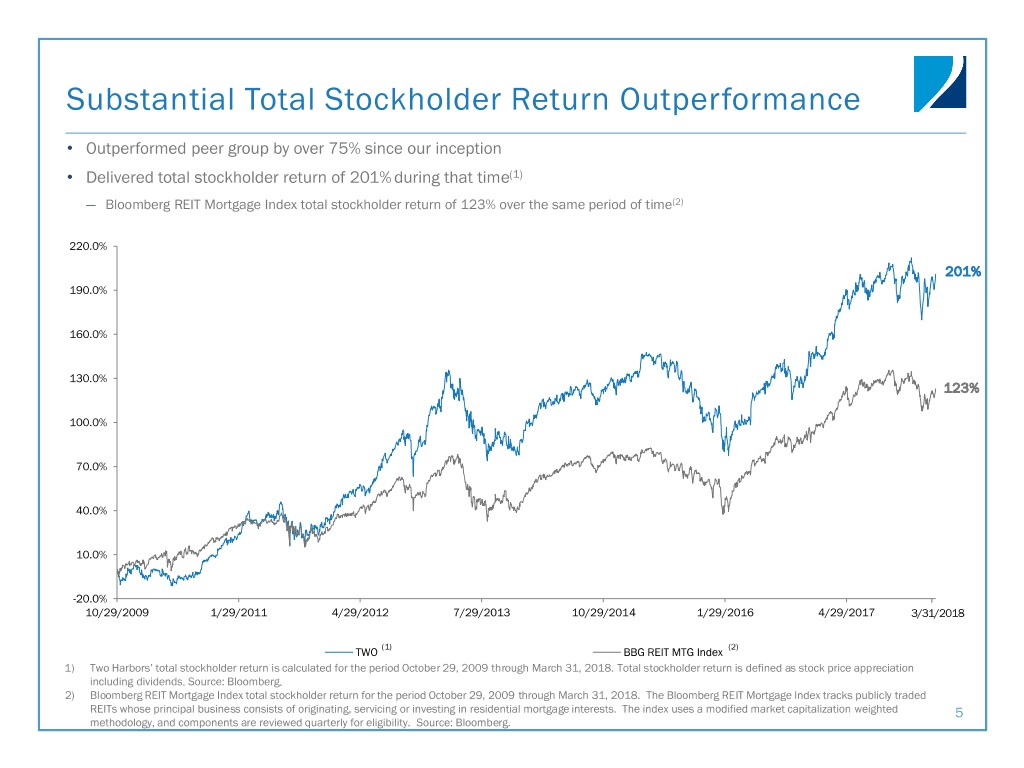 Two Harbors Snapshot $2.7 billion $3.5 billion $22.4 billion hybrid portfolio comprised of Rates market capitalization total stockholders’ equity and Credit strategies(1) 201% 16.4% -2.3% difference in book value volatility total stockholder return since substantial book value growth since compared to mortgage REIT average our inception(2) our inception(3) since our inception(3) KEY DIFFERENTIATING FACTORS Strategy of pairing MSR with Agency RMBS Utilize variety of instruments to hedge interest rate exposure Unique portfolio of legacy non-Agency securities 1) Assets in “Rates” include Agency RMBS, MSR and other interest rate sensitive assets. Assets in “Credit” include non-Agency securities and other credit sensitive assets. 2) Two Harbors’ total stockholder return calculated for the period October 29, 2009 through March 31, 2018. Total stockholder return is defined as stock price appreciation including dividends. Source: Bloomberg. 3) Book value growth and volatility since our inception is measured from December 31, 2009 or the peer company’s inception, whichever is later, through March 31, 2018. Two Harbors quarterly book values have been adjusted for each quarter from Q1 2013 forward to include $1.88 of stock distributions associated with the special dividend of Silver Bay Realty Trust (“Silver Bay”) and, beginning in Q4 2017, $3.67 of stock distributions associated with the special dividend of Granite Point Mortgage Trust Inc. (“Granite Point”) common stock. Peer mortgage REITs include AGNC, ANH, ARR, CIM, CMO, CYS, IVR, MFA, MITT, MTGE, NLY and NYMT. Peer book value figures are based on publicly reported data and have not been adjusted for the return of capital from dividends, if any, to peer stockholders during the same period. Book value volatility calculated by dividing the standard deviation of book values 4 in the measured period by the average book value from the measured period.