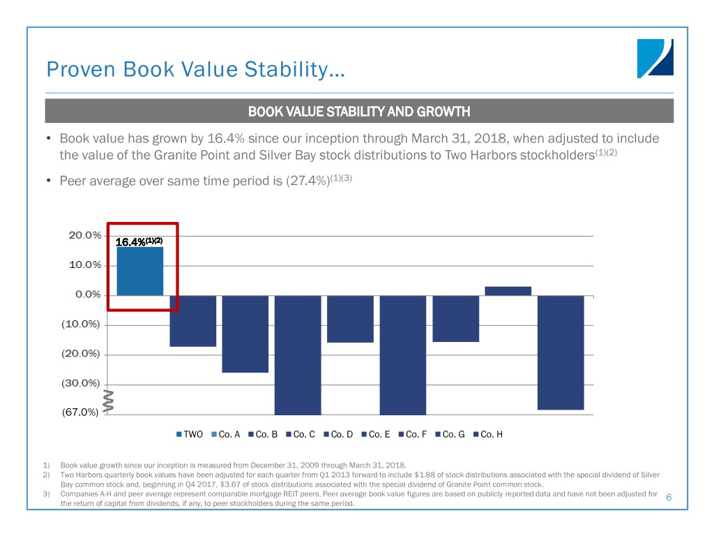Substantial Total Stockholder Return Outperformance • Outperformed peer group by over 75% since our inception • Delivered total stockholder return of 201% during that time(1) ― Bloomberg REIT Mortgage Index total stockholder return of 123% over the same period of time(2) 220.0% 201% 190.0% 160.0% 130.0% 123% 100.0% 70.0% 40.0% 10.0% -20.0% 10/29/2009 1/29/2011 4/29/2012 7/29/2013 10/29/2014 1/29/2016 4/29/2017 3/31/2018 TWO (1) BBG REIT MTG Index (2) 1) Two Harbors’ total stockholder return is calculated for the period October 29, 2009 through March 31, 2018. Total stockholder return is defined as stock price appreciation including dividends. Source: Bloomberg. 2) Bloomberg REIT Mortgage Index total stockholder return for the period October 29, 2009 through March 31, 2018. The Bloomberg REIT Mortgage Index tracks publicly traded REITs whose principal business consists of originating, servicing or investing in residential mortgage interests. The index uses a modified market capitalization weighted 5 methodology, and components are reviewed quarterly for eligibility. Source: Bloomberg.