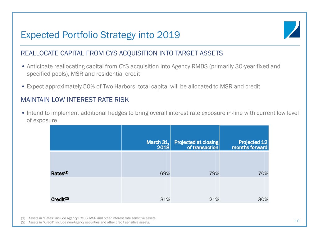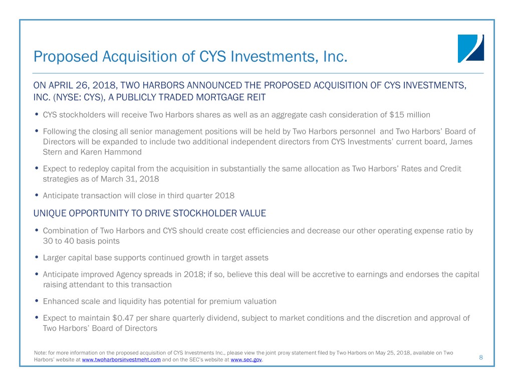 Proposed Acquisition of CYS Investments, Inc. ON APRIL 26, 2018, TWO HARBORS ANNOUNCED THE PROPOSED ACQUISITION OF CYS INVESTMENTS, INC. (NYSE: CYS), A PUBLICLY TRADED MORTGAGE REIT • CYS stockholders will receive Two Harbors shares as well as an aggregate cash consideration of $15 million • Following the closing all senior management positions will be held by Two Harbors personnel and Two Harbors’ Board of Directors will be expanded to include two additional independent directors from CYS Investments’ current board, James Stern and Karen Hammond • Expect to redeploy capital from the acquisition in substantially the same allocation as Two Harbors’ Rates and Credit strategies as of March 31, 2018 • Anticipate transaction will close in third quarter 2018 UNIQUE OPPORTUNITY TO DRIVE STOCKHOLDER VALUE • Combination of Two Harbors and CYS should create cost efficiencies and decrease our other operating expense ratio by 30 to 40 basis points • Larger capital base supports continued growth in target assets • Anticipate improved Agency spreads in 2018; if so, believe this deal will be accretive to earnings and endorses the capital raising attendant to this transaction • Enhanced scale and liquidity has potential for premium valuation • Expect to maintain $0.47 per share quarterly dividend, subject to market conditions and the discretion and approval of Two Harbors’ Board of Directors Note: for more information on the proposed acquisition of CYS Investments Inc., please view the joint proxy statement filed by Two Harbors on May 25, 2018, available on Two Harbors’ website at www.twoharborsinvestmeht.com and on the SEC’s website at www.sec.gov. 8