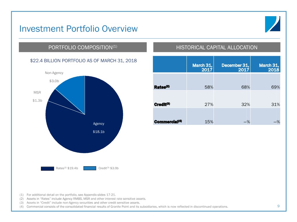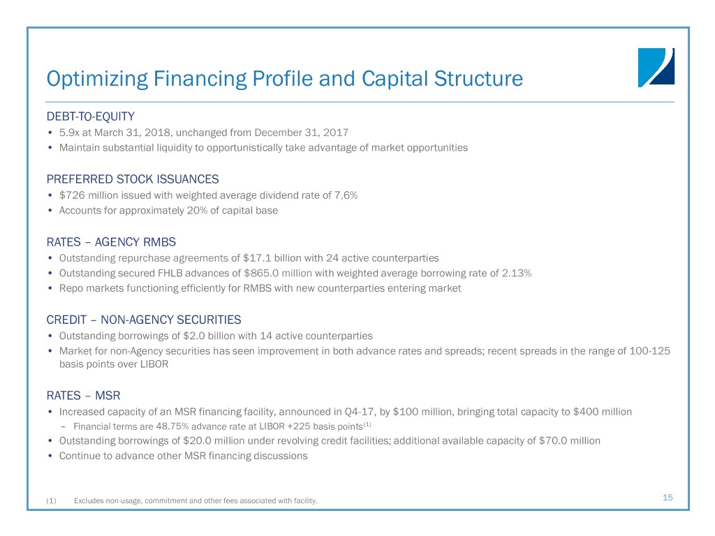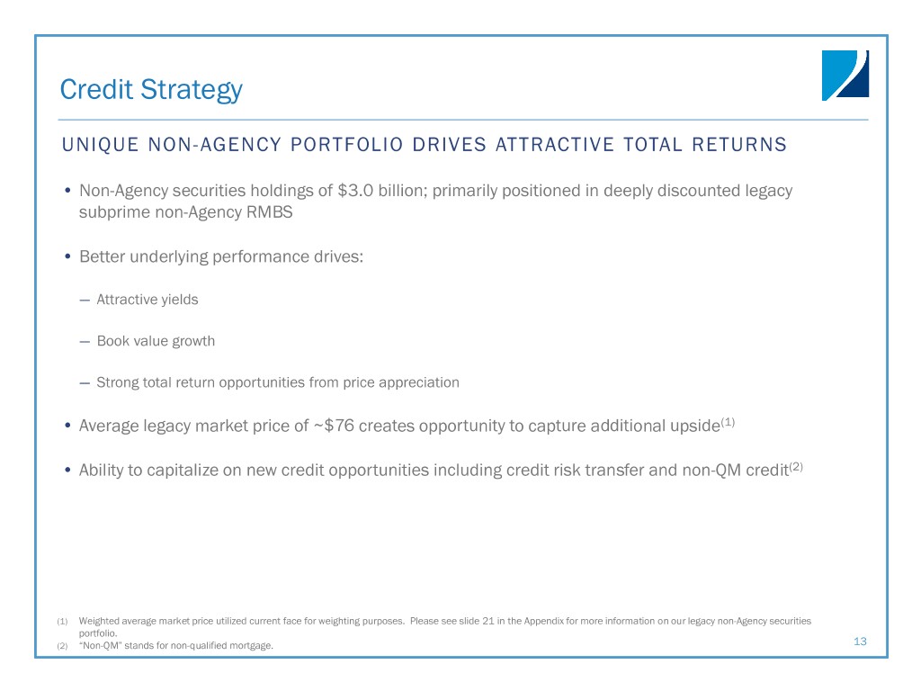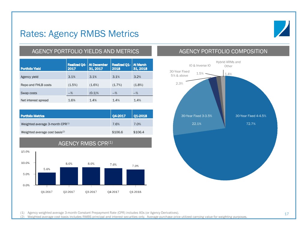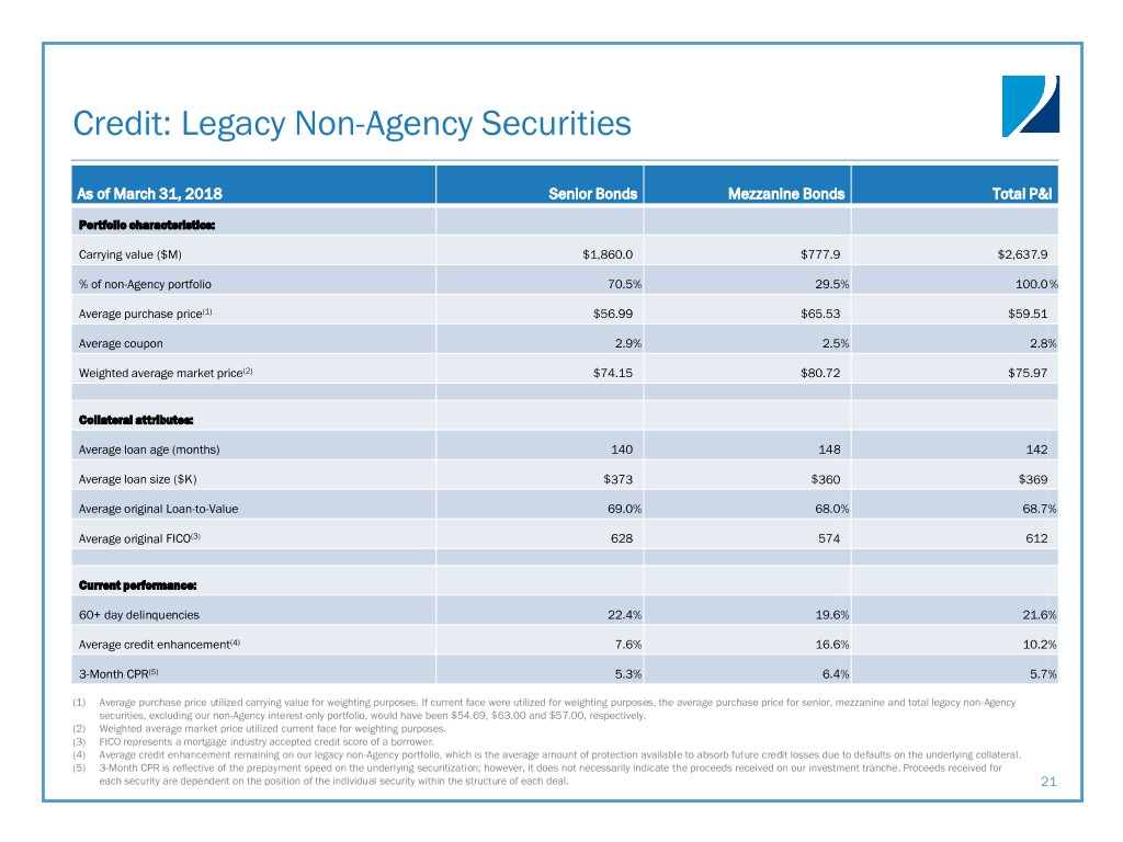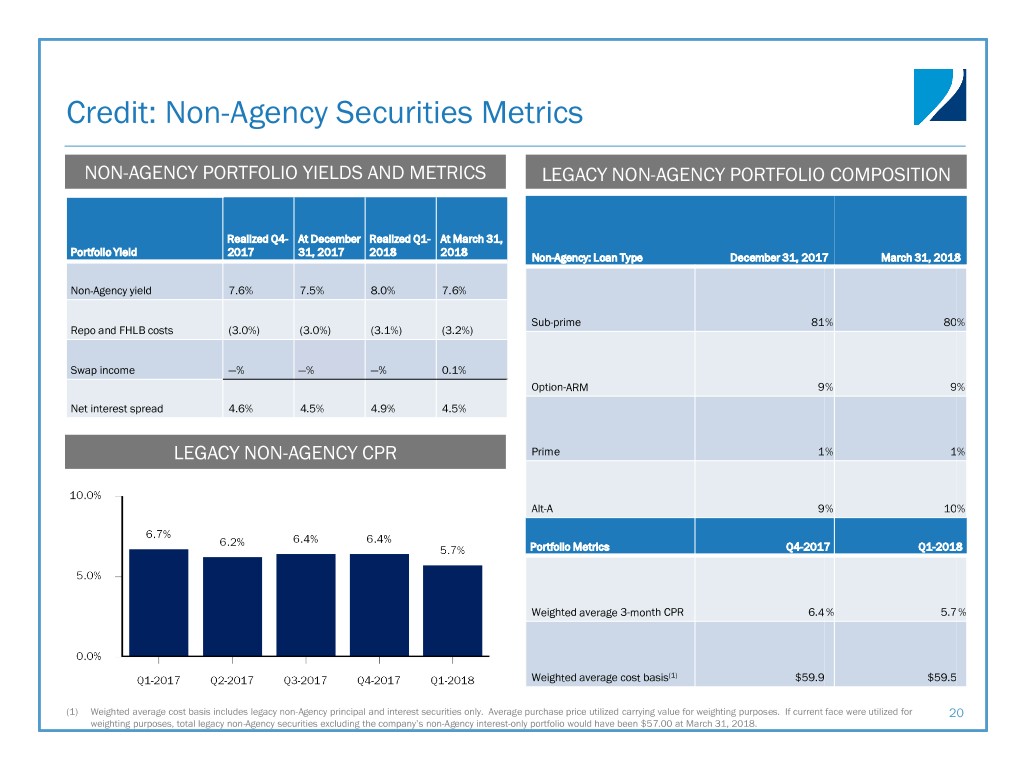 Credit: Non-Agency Securities Metrics NON-AGENCY PORTFOLIO YIELDS AND METRICS LEGACY NON-AGENCY PORTFOLIO COMPOSITION Realized Q4- At December Realized Q1- At March 31, Portfolio Yield 2017 31, 2017 2018 2018 Non-Agency: Loan Type December 31, 2017 March 31, 2018 Non-Agency yield 7.6% 7.5% 8.0% 7.6% Sub-prime 81 % 80% Repo and FHLB costs (3.0%) (3.0%) (3.1%) (3.2%) Swap income —% —% —% 0.1% Option-ARM 9 % 9% Net interest spread 4.6% 4.5% 4.9% 4.5% LEGACY NON-AGENCY CPR Prime 1 % 1% Alt-A 9 % 10% Portfolio Metrics Q4-2017 Q1-2018 Weighted average 3-month CPR 6.4 % 5.7 % Weighted average cost basis(1) $59.9 $59.5 (1) Weighted average cost basis includes legacy non-Agency principal and interest securities only. Average purchase price utilized carrying value for weighting purposes. If current face were utilized for 20 weighting purposes, total legacy non-Agency securities excluding the company’s non-Agency interest-only portfolio would have been $57.00 at March 31, 2018.