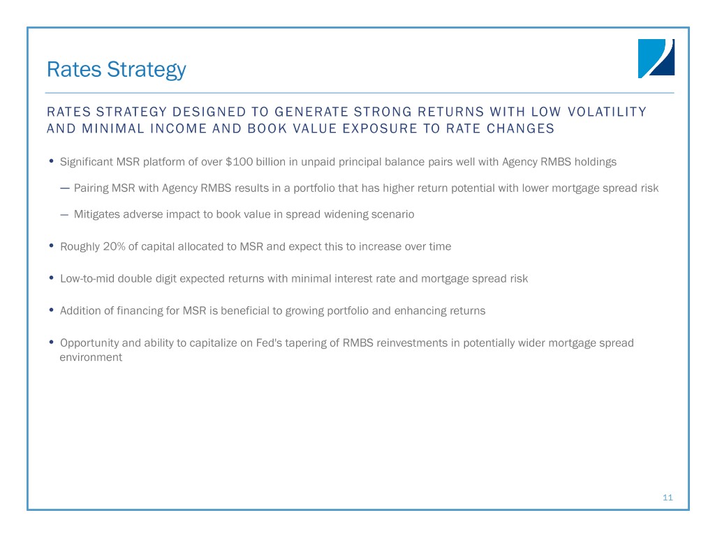 Expected Portfolio Strategy into 2019 REALLOCATE CAPITAL FROM CYS ACQUISITION INTO TARGET ASSETS • Anticipate reallocating capital from CYS acquisition into Agency RMBS (primarily 30-year fixed and specified pools), MSR and residential credit • Expect approximately 50% of Two Harbors’ total capital will be allocated to MSR and credit MAINTAIN LOW INTEREST RATE RISK • Intend to implement additional hedges to bring overall interest rate exposure in-line with current low level of exposure March 31, Projected at closing Projected 12 2018 of transaction months forward Rates(1) 69% 79% 70% Credit(2) 31% 21% 30% (1) Assets in “Rates” include Agency RMBS, MSR and other interest rate sensitive assets. (2) Assets in “Credit” include non-Agency securities and other credit sensitive assets. 10
