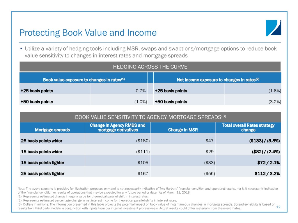 Protecting Book Value and Income • Utilize a variety of hedging tools including MSR, swaps and swaptions/mortgage options to reduce book value sensitivity to changes in interest rates and mortgage spreads HEDGING ACROSS THE CURVE Book value exposure to changes in rates(1) Net income exposure to changes in rates(2) +25 basis points 0.7 % +25 basis points (1.6 %) +50 basis points (1.0 %) +50 basis points (3.2 %) BOOK VALUE SENSITIVITY TO AGENCY MORTGAGE SPREADS(3) Change in Agency RMBS and Total overall Rates strategy Mortgage spreads mortgage derivatives Change in MSR change 25 basis points wider ($180 ) $47 ($133) / (3.8%) 15 basis points wider ($111 ) $29 ($82) / (2.4%) 15 basis points tighter $105 ($33 ) $72 / 2.1% 25 basis points tighter $167 ($55 ) $112 / 3.2% Note: The above scenario is provided for illustration purposes only and is not necessarily indicative of Two Harbors’ financial condition and operating results, nor is it necessarily indicative of the financial condition or results of operations that may be expected for any future period or date. As of March 31, 2018. (1) Represents estimated change in equity value for theoretical parallel shift in interest rates. (2) Represents estimated percentage change in net interest income for theoretical parallel shifts in interest rates. (3) Dollars in millions. The information presented in this table projects the potential impact on book value of instantaneous changes in mortgage spreads. Spread sensitivity is based on results from third party models in conjunction with inputs from our internal investment professionals. Actual results could differ materially from these estimates. 12