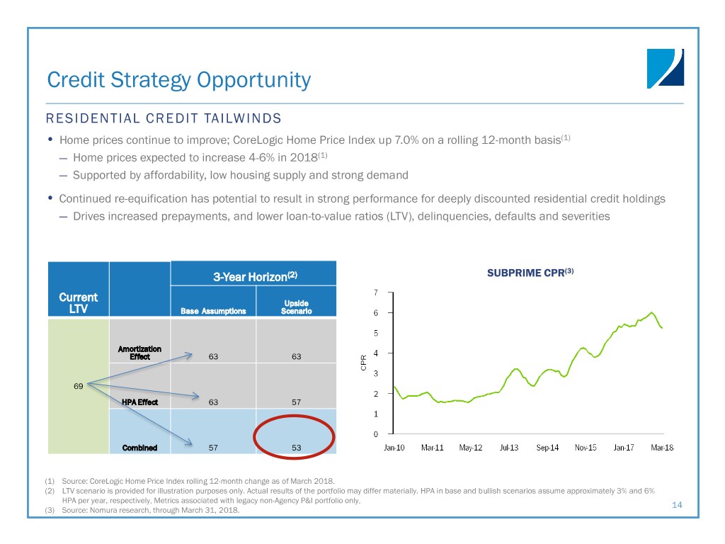 Credit Strategy UNIQUE NON-AGENCY PORTFOLIO DRIVES ATTRACTIVE TOTAL RETURNS • Non-Agency securities holdings of $3.0 billion; primarily positioned in deeply discounted legacy subprime non-Agency RMBS • Better underlying performance drives: ― Attractive yields ― Book value growth ― Strong total return opportunities from price appreciation • Average legacy market price of ~$76 creates opportunity to capture additional upside(1) • Ability to capitalize on new credit opportunities including credit risk transfer and non-QM credit(2) (1) Weighted average market price utilized current face for weighting purposes. Please see slide 21 in the Appendix for more information on our legacy non-Agency securities portfolio. (2) “Non-QM” stands for non-qualified mortgage. 13