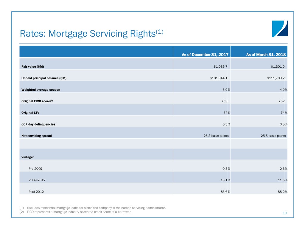 Rates: Mortgage Servicing Rights(1) As of December 31, 2017 As of March 31, 2018 Fair value ($M) $1,086.7 $1,301.0 Unpaid principal balance ($M) $101,344.1 $111,703.2 Weighted average coupon 3.9 % 4.0 % Original FICO score(2) 753 752 Original LTV 74 % 74 % 60+ day delinquencies 0.5 % 0.5 % Net servicing spread 25.3 basis points 25.5 basis points Vintage: Pre-2009 0.3 % 0.3 % 2009-2012 13.1 % 11.5 % Post 2012 86.6 % 88.2 % (1) Excludes residential mortgage loans for which the company is the named servicing administrator. (2) FICO represents a mortgage industry accepted credit score of a borrower. 19