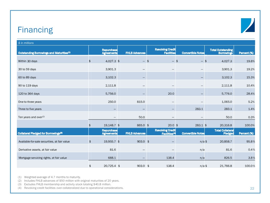 Financing $ in millions Repurchase Revolving Credit Total Outstanding Outstanding Borrowings and Maturities(1) Agreements FHLB Advances Facilities Convertible Notes Borrowings Percent (%) Within 30 days $ 4,027.3 $ — $ — $ — $ 4,027.3 19.8 % 30 to 59 days 3,901.3 — — — 3,901.3 19.2 % 60 to 89 days 3,102.3 — — 3,102.3 15.3 % 90 to 119 days 2,111.8 — — — 2,111.8 10.4 % 120 to 364 days 5,756.0 — 20.0 — 5,776.0 28.4 % One to three years 250.0 815.0 — — 1,065.0 5.2 % Three to five years — — — 283.1 283.1 1.4 % Ten years and over(2) — 50.0 — — 50.0 0.3 % $ 19,148.7 $ 865.0 $ 20.0 $ 283.1 $ 20,316.8 100.0 % Repurchase Revolving Credit Total Collateral Collateral Pledged for Borrowings(3) Agreements FHLB Advances Facilities(4) Convertible Notes Pledged Percent (%) Available-for-sale securities, at fair value $ 19,955.7 $ 903.0 $ — n/a $ 20,858.7 95.8 % Derivative assets, at fair value 81.6 — — n/a 81.6 0.4 % Mortgage servicing rights, at fair value 688.1 — 138.4 n/a 826.5 3.8 % $ 20,725.4 $ 903.0 $ 138.4 n/a $ 21,766.8 100.0 % (1) Weighted average of 4.7 months to maturity. (2) Includes FHLB advances of $50 million with original maturities of 20 years. (3) Excludes FHLB membership and activity stock totaling $40.8 million. (4) Revolving credit facilities over-collateralized due to operational considerations. 22