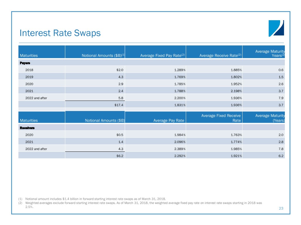 Interest Rate Swaps Average Maturity Maturities Notional Amounts ($B)(1) Average Fixed Pay Rate(2) Average Receive Rate(2) Years(2) Payers 2018 $2.0 1.289 % 1.885% 0.6 2019 4.3 1.769 % 1.802% 1.5 2020 2.9 1.785 % 1.952% 2.6 2021 2.4 1.788 % 2.198% 3.7 2022 and after 5.8 2.200 % 1.936% 7.9 $17.4 1.831 % 1.936% 3.7 Average Fixed Receive Average Maturity Maturities Notional Amounts ($B) Average Pay Rate Rate (Years) Receivers 2020 $0.5 1.984 % 1.763% 2.0 2021 1.4 2.096 % 1.774% 2.8 2022 and after 4.3 2.389 % 1.985% 7.8 $6.2 2.292 % 1.921% 6.2 (1) Notional amount includes $1.4 billion in forward starting interest rate swaps as of March 31, 2018. (2) Weighted averages exclude forward starting interest rate swaps. As of March 31, 2018, the weighted average fixed pay rate on interest rate swaps starting in 2018 was 2.5%. 23
