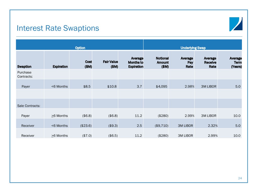 Interest Rate Swaptions Option Underlying Swap Average Notional Average Average Average Cost Fair Value Months to Amount Pay Receive Term Swaption Expiration ($M) ($M) Expiration ($M) Rate Rate (Years) Purchase Contracts: Payer <6 Months $8.5 $10.8 3.7 $4,095 2.98% 3M LIBOR 5.0 Sale Contracts: Payer >6 Months ($6.8 ) ($6.8 ) 11.2 ($280 ) 2.99% 3M LIBOR 10.0 Receiver <6 Months ($23.6 ) ($9.3 ) 2.5 ($9,710 ) 3M LIBOR 2.32 % 5.0 Receiver >6 Months ($7.0 ) ($6.5 ) 11.2 ($280 ) 3M LIBOR 2.99 % 10.0 24