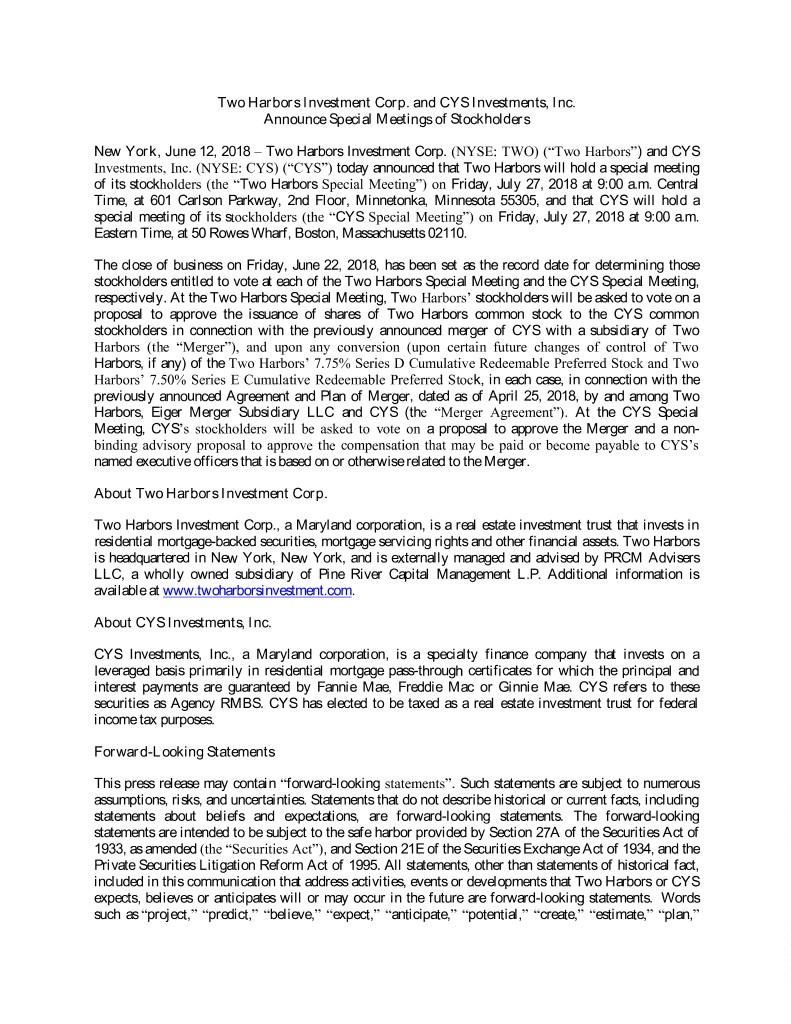Two Harbors Investment Corp. and CYS Investments, Inc. Announce Special Meetings of Stockholders New York, June 12, 2018 – Two Harbors Investment Corp. (NYSE: TWO) (“Two Harbors”) and CYS Investments, Inc. (NYSE: CYS) (“CYS”) today announced that Two Harbors will hold a special meeting of its stockholders (the “Two Harbors Special Meeting”) on Friday, July 27, 2018 at 9:00 a.m. Central Time, at 601 Carlson Parkway, 2nd Floor, Minnetonka, Minnesota 55305, and that CYS will hold a special meeting of its stockholders (the “CYS Special Meeting”) on Friday, July 27, 2018 at 9:00 a.m. Eastern Time, at 50 Rowes Wharf, Boston, Massachusetts 02110. The close of business on Friday, June 22, 2018, has been set as the record date for determining those stockholders entitled to vote at each of the Two Harbors Special Meeting and the CYS Special Meeting, respectively. At the Two Harbors Special Meeting, Two Harbors’ stockholders will be asked to vote on a proposal to approve the issuance of shares of Two Harbors common stock to the CYS common stockholders in connection with the previously announced merger of CYS with a subsidiary of Two Harbors (the “Merger”), and upon any conversion (upon certain future changes of control of Two Harbors, if any) of the Two Harbors’ 7.75% Series D Cumulative Redeemable Preferred Stock and Two Harbors’ 7.50% Series E Cumulative Redeemable Preferred Stock, in each case, in connection with the previously announced Agreement and Plan of Merger, dated as of April 25, 2018, by and among Two Harbors, Eiger Merger Subsidiary LLC and CYS (the “Merger Agreement”). At the CYS Special Meeting, CYS’s stockholders will be asked to vote on a proposal to approve the Merger and a non- binding advisory proposal to approve the compensation that may be paid or become payable to CYS’s named executive officers that is based on or otherwise related to the Merger. About Two Harbors Investment Corp. Two Harbors Investment Corp., a Maryland corporation, is a real estate investment trust that invests in residential mortgage-backed securities, mortgage servicing rights and other financial assets. Two Harbors is headquartered in New York, New York, and is externally managed and advised by PRCM Advisers LLC, a wholly owned subsidiary of Pine River Capital Management L.P. Additional information is available at www.twoharborsinvestment.com. About CYS Investments, Inc. CYS Investments, Inc., a Maryland corporation, is a specialty finance company that invests on a leveraged basis primarily in residential mortgage pass-through certificates for which the principal and interest payments are guaranteed by Fannie Mae, Freddie Mac or Ginnie Mae. CYS refers to these securities as Agency RMBS. CYS has elected to be taxed as a real estate investment trust for federal income tax purposes. Forward-Looking Statements This press release may contain “forward-looking statements”. Such statements are subject to numerous assumptions, risks, and uncertainties. Statements that do not describe historical or current facts, including statements about beliefs and expectations, are forward-looking statements. The forward-looking statements are intended to be subject to the safe harbor provided by Section 27A of the Securities Act of 1933, as amended (the “Securities Act”), and Section 21E of the Securities Exchange Act of 1934, and the Private Securities Litigation Reform Act of 1995. All statements, other than statements of historical fact, included in this communication that address activities, events or developments that Two Harbors or CYS expects, believes or anticipates will or may occur in the future are forward-looking statements. Words such as “project,” “predict,” “believe,” “expect,” “anticipate,” “potential,” “create,” “estimate,” “plan,”