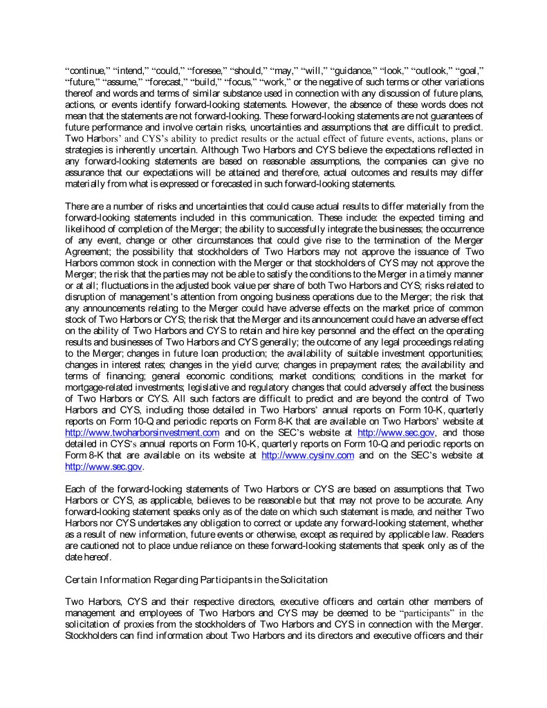 “continue,” “intend,” “could,” “foresee,” “should,” “may,” “will,” “guidance,” “look,” “outlook,” “goal,” “future,” “assume,” “forecast,” “build,” “focus,” “work,” or the negative of such terms or other variations thereof and words and terms of similar substance used in connection with any discussion of future plans, actions, or events identify forward-looking statements. However, the absence of these words does not mean that the statements are not forward-looking. These forward-looking statements are not guarantees of future performance and involve certain risks, uncertainties and assumptions that are difficult to predict. Two Harbors’ and CYS’s ability to predict results or the actual effect of future events, actions, plans or strategies is inherently uncertain. Although Two Harbors and CYS believe the expectations reflected in any forward-looking statements are based on reasonable assumptions, the companies can give no assurance that our expectations will be attained and therefore, actual outcomes and results may differ materially from what is expressed or forecasted in such forward-looking statements. There are a number of risks and uncertainties that could cause actual results to differ materially from the forward-looking statements included in this communication. These include: the expected timing and likelihood of completion of the Merger; the ability to successfully integrate the businesses; the occurrence of any event, change or other circumstances that could give rise to the termination of the Merger Agreement; the possibility that stockholders of Two Harbors may not approve the issuance of Two Harbors common stock in connection with the Merger or that stockholders of CYS may not approve the Merger; the risk that the parties may not be able to satisfy the conditions to the Merger in a timely manner or at all; fluctuations in the adjusted book value per share of both Two Harbors and CYS; risks related to disruption of management’s attention from ongoing business operations due to the Merger; the risk that any announcements relating to the Merger could have adverse effects on the market price of common stock of Two Harbors or CYS; the risk that the Merger and its announcement could have an adverse effect on the ability of Two Harbors and CYS to retain and hire key personnel and the effect on the operating results and businesses of Two Harbors and CYS generally; the outcome of any legal proceedings relating to the Merger; changes in future loan production; the availability of suitable investment opportunities; changes in interest rates; changes in the yield curve; changes in prepayment rates; the availability and terms of financing; general economic conditions; market conditions; conditions in the market for mortgage-related investments; legislative and regulatory changes that could adversely affect the business of Two Harbors or CYS. All such factors are difficult to predict and are beyond the control of Two Harbors and CYS, including those detailed in Two Harbors’ annual reports on Form 10-K, quarterly reports on Form 10-Q and periodic reports on Form 8-K that are available on Two Harbors’ website at http://www.twoharborsinvestment.com and on the SEC’s website at http://www.sec.gov, and those detailed in CYS’s annual reports on Form 10-K, quarterly reports on Form 10-Q and periodic reports on Form 8-K that are available on its website at http://www.cysinv.com and on the SEC’s website at http://www.sec.gov. Each of the forward-looking statements of Two Harbors or CYS are based on assumptions that Two Harbors or CYS, as applicable, believes to be reasonable but that may not prove to be accurate. Any forward-looking statement speaks only as of the date on which such statement is made, and neither Two Harbors nor CYS undertakes any obligation to correct or update any forward-looking statement, whether as a result of new information, future events or otherwise, except as required by applicable law. Readers are cautioned not to place undue reliance on these forward-looking statements that speak only as of the date hereof. Certain Information Regarding Participants in the Solicitation Two Harbors, CYS and their respective directors, executive officers and certain other members of management and employees of Two Harbors and CYS may be deemed to be “participants” in the solicitation of proxies from the stockholders of Two Harbors and CYS in connection with the Merger. Stockholders can find information about Two Harbors and its directors and executive officers and their