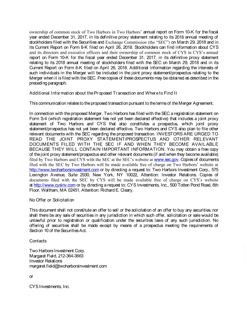 ownership of common stock of Two Harbors in Two Harbors’ annual report on Form 10-K for the fiscal year ended December 31, 2017, in its definitive proxy statement relating to its 2018 annual meeting of stockholders filed with the Securities and Exchange Commission (the “SEC”) on March 29, 2018 and in its Current Report on Form 8-K filed on April 26, 2018. Stockholders can find information about CYS and its directors and executive officers and their ownership of common stock of CYS in CYS’s annual report on Form 10-K for the fiscal year ended December 31, 2017, in its definitive proxy statement relating to its 2018 annual meeting of stockholders filed with the SEC on March 29, 2018 and in its Current Report on Form 8-K filed on April 26, 2018. Additional information regarding the interests of such individuals in the Merger will be included in the joint proxy statement/prospectus relating to the Merger when it is filed with the SEC. Free copies of these documents may be obtained as described in the preceding paragraph. Additional Information about the Proposed Transaction and Where to Find It This communication relates to the proposed transaction pursuant to the terms of the Merger Agreement. In connection with the proposed Merger, Two Harbors has filed with the SEC a registration statement on Form S-4 (which registration statement has not yet been declared effective) that includes a joint proxy statement of Two Harbors and CYS that also constitutes a prospectus, which joint proxy statement/prospectus has not yet been declared effective. Two Harbors and CYS also plan to file other relevant documents with the SEC regarding the proposed transaction. INVESTORS ARE URGED TO READ THE JOINT PROXY STATEMENT/PROSPECTUS AND OTHER RELEVANT DOCUMENTS FILED WITH THE SEC IF AND WHEN THEY BECOME AVAILABLE BECAUSE THEY WILL CONTAIN IMPORTANT INFORMATION. You may obtain a free copy of the joint proxy statement/prospectus and other relevant documents (if and when they become available) filed by Two Harbors and CYS with the SEC at the SEC’s website at www.sec.gov. Copies of documents filed with the SEC by Two Harbors will be made available free of charge on Two Harbors’ website at http://www.twoharborsinvestment.com or by directing a request to: Two Harbors Investment Corp., 575 Lexington Avenue, Suite 2930, New York, NY 10022, Attention: Investor Relations. Copies of documents filed with the SEC by CYS will be made available free of charge on CYS’s website at http://www.cysinv.com or by directing a request to: CYS Investments, Inc., 500 Totten Pond Road, 6th Floor, Waltham, MA 02451, Attention: Richard E. Cleary. No Offer or Solicitation This document shall not constitute an offer to sell or the solicitation of an offer to buy any securities, nor shall there be any sale of securities in any jurisdiction in which such offer, solicitation or sale would be unlawful prior to registration or qualification under the securities laws of any such jurisdiction. No offering of securities shall be made except by means of a prospectus meeting the requirements of Section 10 of the Securities Act. Contacts Two Harbors Investment Corp. Margaret Field, 212-364-3663 Investor Relations margaret.field@twoharborsinvestment.com or CYS Investments, Inc.