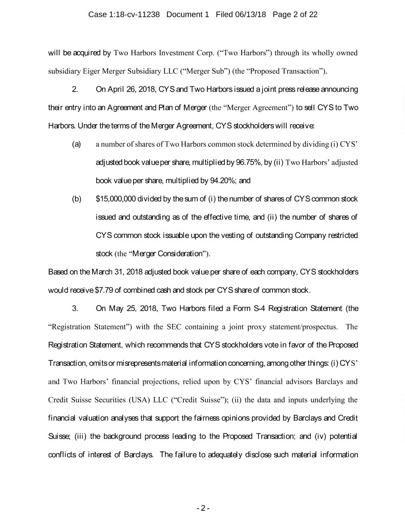 Case 1:18-cv-11238 Document 1 Filed 06/13/18 Page 2 of 22 will be acquired by Two Harbors Investment Corp. (“Two Harbors”) through its wholly owned subsidiary Eiger Merger Subsidiary LLC (“Merger Sub”) (the “Proposed Transaction”). 2. On April 26, 2018, CYS and Two Harbors issued a joint press release announcing their entry into an Agreement and Plan of Merger (the “Merger Agreement”) to sell CYS to Two Harbors. Under the terms of the Merger Agreement, CYS stockholders will receive: (a) a number of shares of Two Harbors common stock determined by dividing (i) CYS’ adjusted book value per share, multiplied by 96.75%, by (ii) Two Harbors’ adjusted book value per share, multiplied by 94.20%; and (b) $15,000,000 divided by the sum of (i) the number of shares of CYS common stock issued and outstanding as of the effective time, and (ii) the number of shares of CYS common stock issuable upon the vesting of outstanding Company restricted stock (the “Merger Consideration”). Based on the March 31, 2018 adjusted book value per share of each company, CYS stockholders would receive $7.79 of combined cash and stock per CYS share of common stock. 3. On May 25, 2018, Two Harbors filed a Form S-4 Registration Statement (the “Registration Statement”) with the SEC containing a joint proxy statement/prospectus. The Registration Statement, which recommends that CYS stockholders vote in favor of the Proposed Transaction, omits or misrepresents material information concerning, among other things: (i) CYS’ and Two Harbors’ financial projections, relied upon by CYS’ financial advisors Barclays and Credit Suisse Securities (USA) LLC (“Credit Suisse”); (ii) the data and inputs underlying the financial valuation analyses that support the fairness opinions provided by Barclays and Credit Suisse; (iii) the background process leading to the Proposed Transaction; and (iv) potential conflicts of interest of Barclays. The failure to adequately disclose such material information - 2 -