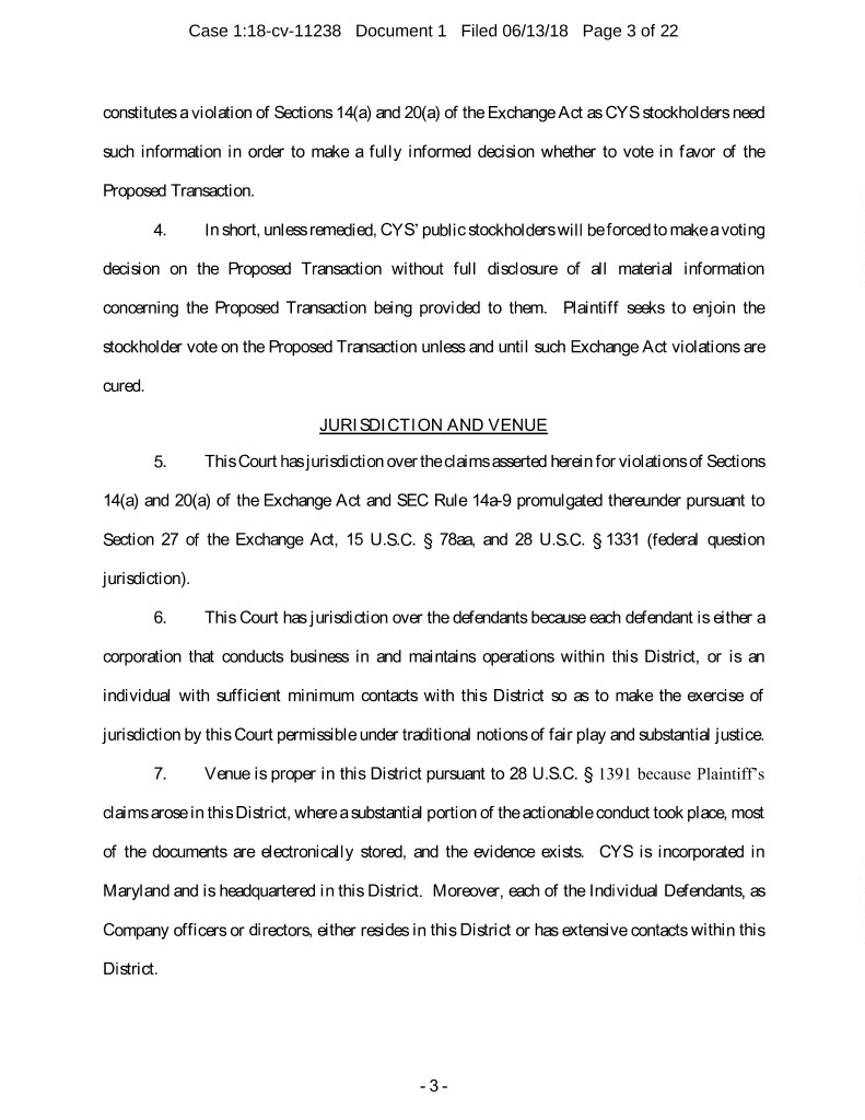 Case 1:18-cv-11238 Document 1 Filed 06/13/18 Page 3 of 22 constitutes a violation of Sections 14(a) and 20(a) of the Exchange Act as CYS stockholders need such information in order to make a fully informed decision whether to vote in favor of the Proposed Transaction. 4. In short, unless remedied, CYS’ public stockholders will be forced to make a voting decision on the Proposed Transaction without full disclosure of all material information concerning the Proposed Transaction being provided to them. Plaintiff seeks to enjoin the stockholder vote on the Proposed Transaction unless and until such Exchange Act violations are cured. JURISDICTION AND VENUE 5. This Court has jurisdiction over the claims asserted herein for violations of Sections 14(a) and 20(a) of the Exchange Act and SEC Rule 14a-9 promulgated thereunder pursuant to Section 27 of the Exchange Act, 15 U.S.C. § 78aa, and 28 U.S.C. § 1331 (federal question jurisdiction). 6. This Court has jurisdiction over the defendants because each defendant is either a corporation that conducts business in and maintains operations within this District, or is an individual with sufficient minimum contacts with this District so as to make the exercise of jurisdiction by this Court permissible under traditional notions of fair play and substantial justice. 7. Venue is proper in this District pursuant to 28 U.S.C. § 1391 because Plaintiff’s claims arose in this District, where a substantial portion of the actionable conduct took place, most of the documents are electronically stored, and the evidence exists. CYS is incorporated in Maryland and is headquartered in this District. Moreover, each of the Individual Defendants, as Company officers or directors, either resides in this District or has extensive contacts within this District. - 3 -