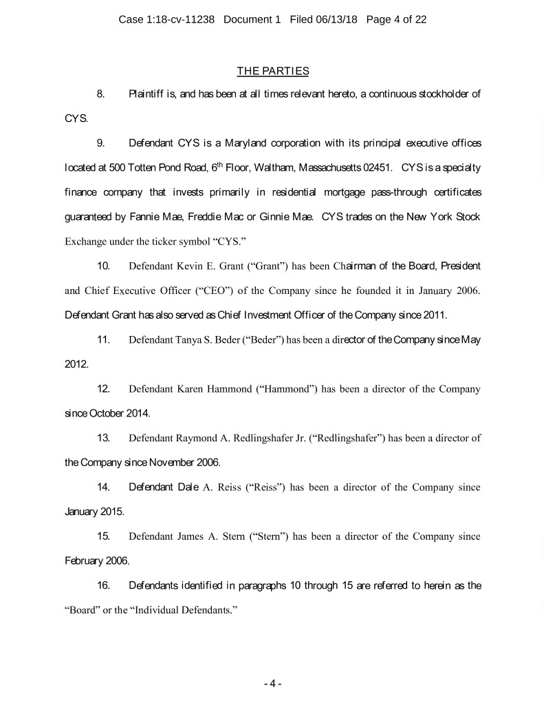 Case 1:18-cv-11238 Document 1 Filed 06/13/18 Page 4 of 22 THE PARTIES 8. Plaintiff is, and has been at all times relevant hereto, a continuous stockholder of CYS. 9. Defendant CYS is a Maryland corporation with its principal executive offices located at 500 Totten Pond Road, 6th Floor, Waltham, Massachusetts 02451. CYS is a specialty finance company that invests primarily in residential mortgage pass-through certificates guaranteed by Fannie Mae, Freddie Mac or Ginnie Mae. CYS trades on the New York Stock Exchange under the ticker symbol “CYS.” 10. Defendant Kevin E. Grant (“Grant”) has been Chairman of the Board, President and Chief Executive Officer (“CEO”) of the Company since he founded it in January 2006. Defendant Grant has also served as Chief Investment Officer of the Company since 2011. 11. Defendant Tanya S. Beder (“Beder”) has been a director of the Company since May 2012. 12. Defendant Karen Hammond (“Hammond”) has been a director of the Company since October 2014. 13. Defendant Raymond A. Redlingshafer Jr. (“Redlingshafer”) has been a director of the Company since November 2006. 14. Defendant Dale A. Reiss (“Reiss”) has been a director of the Company since January 2015. 15. Defendant James A. Stern (“Stern”) has been a director of the Company since February 2006. 16. Defendants identified in paragraphs 10 through 15 are referred to herein as the “Board” or the “Individual Defendants.” - 4 -