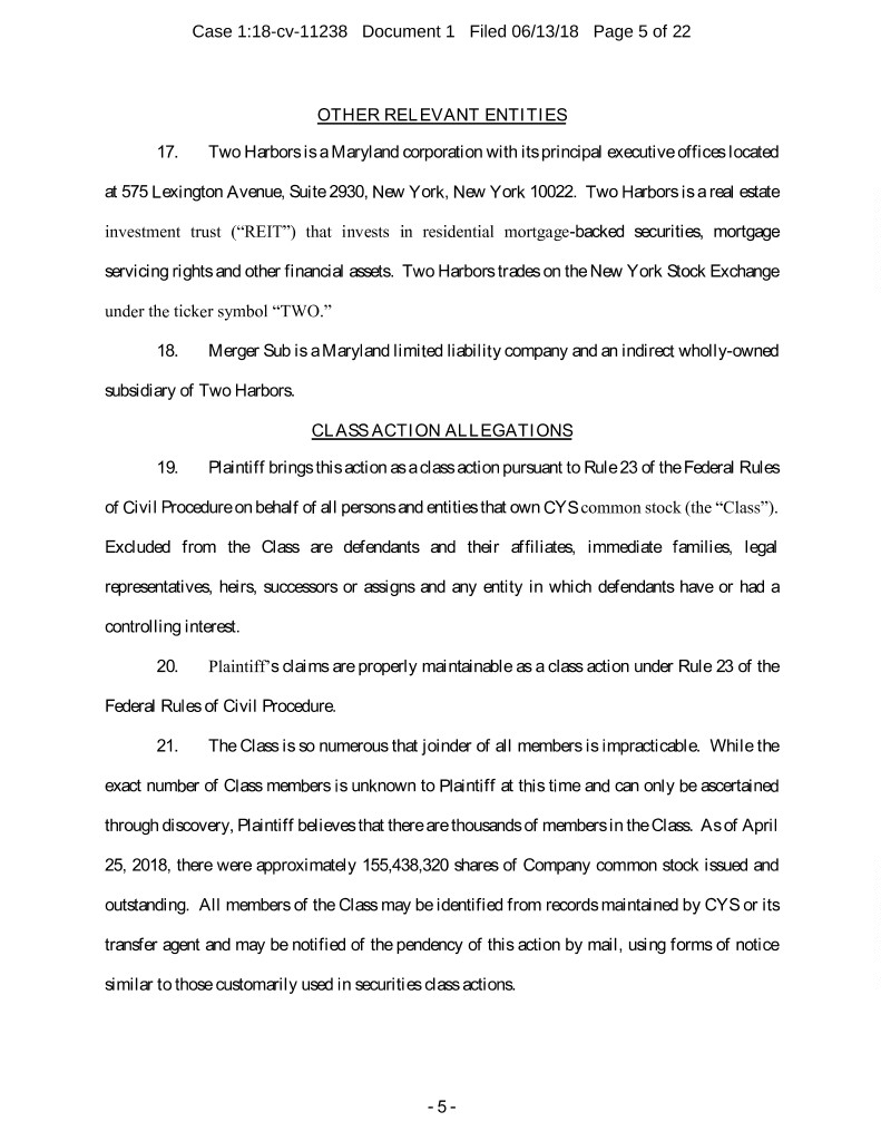 Case 1:18-cv-11238 Document 1 Filed 06/13/18 Page 5 of 22 OTHER RELEVANT ENTITIES 17. Two Harbors is a Maryland corporation with its principal executive offices located at 575 Lexington Avenue, Suite 2930, New York, New York 10022. Two Harbors is a real estate investment trust (“REIT”) that invests in residential mortgage-backed securities, mortgage servicing rights and other financial assets. Two Harbors trades on the New York Stock Exchange under the ticker symbol “TWO.” 18. Merger Sub is a Maryland limited liability company and an indirect wholly-owned subsidiary of Two Harbors. CLASS ACTION ALLEGATIONS 19. Plaintiff brings this action as a class action pursuant to Rule 23 of the Federal Rules of Civil Procedure on behalf of all persons and entities that own CYS common stock (the “Class”). Excluded from the Class are defendants and their affiliates, immediate families, legal representatives, heirs, successors or assigns and any entity in which defendants have or had a controlling interest. 20. Plaintiff’s claims are properly maintainable as a class action under Rule 23 of the Federal Rules of Civil Procedure. 21. The Class is so numerous that joinder of all members is impracticable. While the exact number of Class members is unknown to Plaintiff at this time and can only be ascertained through discovery, Plaintiff believes that there are thousands of members in the Class. As of April 25, 2018, there were approximately 155,438,320 shares of Company common stock issued and outstanding. All members of the Class may be identified from records maintained by CYS or its transfer agent and may be notified of the pendency of this action by mail, using forms of notice similar to those customarily used in securities class actions. - 5 -
