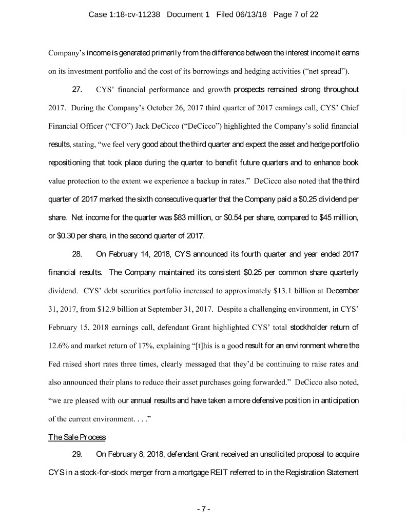 Case 1:18-cv-11238 Document 1 Filed 06/13/18 Page 7 of 22 Company’s income is generated primarily from the difference between the interest income it earns on its investment portfolio and the cost of its borrowings and hedging activities (“net spread”). 27. CYS’ financial performance and growth prospects remained strong throughout 2017. During the Company’s October 26, 2017 third quarter of 2017 earnings call, CYS’ Chief Financial Officer (“CFO”) Jack DeCicco (“DeCicco”) highlighted the Company’s solid financial results, stating, “we feel very good about the third quarter and expect the asset and hedge portfolio repositioning that took place during the quarter to benefit future quarters and to enhance book value protection to the extent we experience a backup in rates.” DeCicco also noted that the third quarter of 2017 marked the sixth consecutive quarter that the Company paid a $0.25 dividend per share. Net income for the quarter was $83 million, or $0.54 per share, compared to $45 million, or $0.30 per share, in the second quarter of 2017. 28. On February 14, 2018, CYS announced its fourth quarter and year ended 2017 financial results. The Company maintained its consistent $0.25 per common share quarterly dividend. CYS’ debt securities portfolio increased to approximately $13.1 billion at December 31, 2017, from $12.9 billion at September 31, 2017. Despite a challenging environment, in CYS’ February 15, 2018 earnings call, defendant Grant highlighted CYS’ total stockholder return of 12.6% and market return of 17%, explaining “[t]his is a good result for an environment where the Fed raised short rates three times, clearly messaged that they’d be continuing to raise rates and also announced their plans to reduce their asset purchases going forwarded.” DeCicco also noted, “we are pleased with our annual results and have taken a more defensive position in anticipation of the current environment. . . .” The Sale Process 29. On February 8, 2018, defendant Grant received an unsolicited proposal to acquire CYS in a stock-for-stock merger from a mortgage REIT referred to in the Registration Statement - 7 -