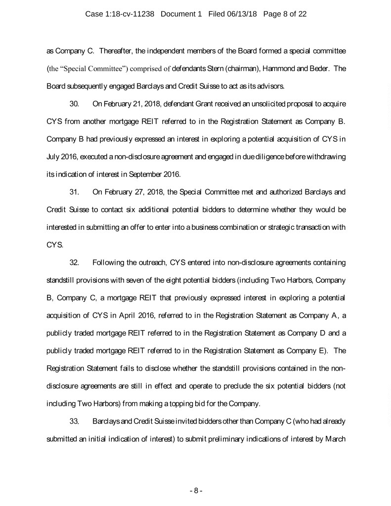 Case 1:18-cv-11238 Document 1 Filed 06/13/18 Page 8 of 22 as Company C. Thereafter, the independent members of the Board formed a special committee (the “Special Committee”) comprised of defendants Stern (chairman), Hammond and Beder. The Board subsequently engaged Barclays and Credit Suisse to act as its advisors. 30. On February 21, 2018, defendant Grant received an unsolicited proposal to acquire CYS from another mortgage REIT referred to in the Registration Statement as Company B. Company B had previously expressed an interest in exploring a potential acquisition of CYS in July 2016, executed a non-disclosure agreement and engaged in due diligence before withdrawing its indication of interest in September 2016. 31. On February 27, 2018, the Special Committee met and authorized Barclays and Credit Suisse to contact six additional potential bidders to determine whether they would be interested in submitting an offer to enter into a business combination or strategic transaction with CYS. 32. Following the outreach, CYS entered into non-disclosure agreements containing standstill provisions with seven of the eight potential bidders (including Two Harbors, Company B, Company C, a mortgage REIT that previously expressed interest in exploring a potential acquisition of CYS in April 2016, referred to in the Registration Statement as Company A, a publicly traded mortgage REIT referred to in the Registration Statement as Company D and a publicly traded mortgage REIT referred to in the Registration Statement as Company E). The Registration Statement fails to disclose whether the standstill provisions contained in the non- disclosure agreements are still in effect and operate to preclude the six potential bidders (not including Two Harbors) from making a topping bid for the Company. 33. Barclays and Credit Suisse invited bidders other than Company C (who had already submitted an initial indication of interest) to submit preliminary indications of interest by March - 8 -