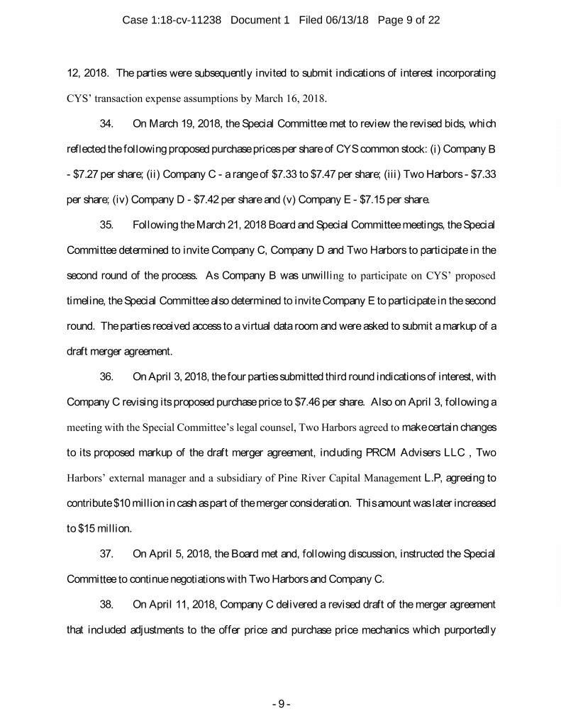Case 1:18-cv-11238 Document 1 Filed 06/13/18 Page 9 of 22 12, 2018. The parties were subsequently invited to submit indications of interest incorporating CYS’ transaction expense assumptions by March 16, 2018. 34. On March 19, 2018, the Special Committee met to review the revised bids, which reflected the following proposed purchase prices per share of CYS common stock: (i) Company B - $7.27 per share; (ii) Company C - a range of $7.33 to $7.47 per share; (iii) Two Harbors - $7.33 per share; (iv) Company D - $7.42 per share and (v) Company E - $7.15 per share. 35. Following the March 21, 2018 Board and Special Committee meetings, the Special Committee determined to invite Company C, Company D and Two Harbors to participate in the second round of the process. As Company B was unwilling to participate on CYS’ proposed timeline, the Special Committee also determined to invite Company E to participate in the second round. The parties received access to a virtual data room and were asked to submit a markup of a draft merger agreement. 36. On April 3, 2018, the four parties submitted third round indications of interest, with Company C revising its proposed purchase price to $7.46 per share. Also on April 3, following a meeting with the Special Committee’s legal counsel, Two Harbors agreed to make certain changes to its proposed markup of the draft merger agreement, including PRCM Advisers LLC , Two Harbors’ external manager and a subsidiary of Pine River Capital Management L.P, agreeing to contribute $10 million in cash as part of the merger consideration. This amount was later increased to $15 million. 37. On April 5, 2018, the Board met and, following discussion, instructed the Special Committee to continue negotiations with Two Harbors and Company C. 38. On April 11, 2018, Company C delivered a revised draft of the merger agreement that included adjustments to the offer price and purchase price mechanics which purportedly - 9 -