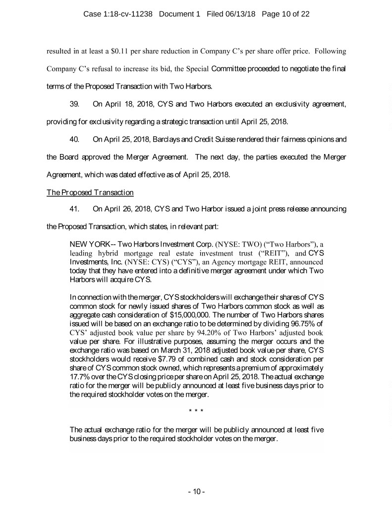 Case 1:18-cv-11238 Document 1 Filed 06/13/18 Page 10 of 22 resulted in at least a $0.11 per share reduction in Company C’s per share offer price. Following Company C’s refusal to increase its bid, the Special Committee proceeded to negotiate the final terms of the Proposed Transaction with Two Harbors. 39. On April 18, 2018, CYS and Two Harbors executed an exclusivity agreement, providing for exclusivity regarding a strategic transaction until April 25, 2018. 40. On April 25, 2018, Barclays and Credit Suisse rendered their fairness opinions and the Board approved the Merger Agreement. The next day, the parties executed the Merger Agreement, which was dated effective as of April 25, 2018. The Proposed Transaction 41. On April 26, 2018, CYS and Two Harbor issued a joint press release announcing the Proposed Transaction, which states, in relevant part: NEW YORK-- Two Harbors Investment Corp. (NYSE: TWO) (“Two Harbors”), a leading hybrid mortgage real estate investment trust (“REIT”), and CYS Investments, Inc. (NYSE: CYS) (“CYS”), an Agency mortgage REIT, announced today that they have entered into a definitive merger agreement under which Two Harbors will acquire CYS. In connection with the merger, CYS stockholders will exchange their shares of CYS common stock for newly issued shares of Two Harbors common stock as well as aggregate cash consideration of $15,000,000. The number of Two Harbors shares issued will be based on an exchange ratio to be determined by dividing 96.75% of CYS’ adjusted book value per share by 94.20% of Two Harbors’ adjusted book value per share. For illustrative purposes, assuming the merger occurs and the exchange ratio was based on March 31, 2018 adjusted book value per share, CYS stockholders would receive $7.79 of combined cash and stock consideration per share of CYS common stock owned, which represents a premium of approximately 17.7% over the CYS closing price per share on April 25, 2018. The actual exchange ratio for the merger will be publicly announced at least five business days prior to the required stockholder votes on the merger. * * * The actual exchange ratio for the merger will be publicly announced at least five business days prior to the required stockholder votes on the merger. - 10 -