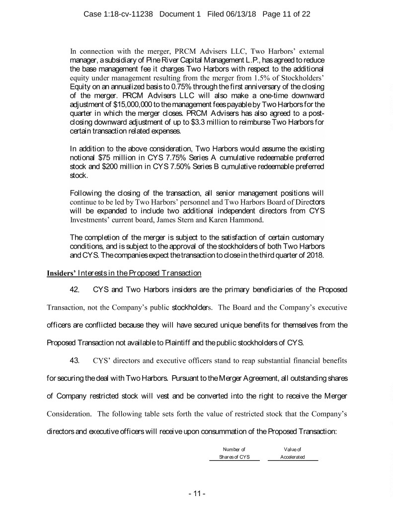 Case 1:18-cv-11238 Document 1 Filed 06/13/18 Page 11 of 22 In connection with the merger, PRCM Advisers LLC, Two Harbors’ external manager, a subsidiary of Pine River Capital Management L.P., has agreed to reduce the base management fee it charges Two Harbors with respect to the additional equity under management resulting from the merger from 1.5% of Stockholders’ Equity on an annualized basis to 0.75% through the first anniversary of the closing of the merger. PRCM Advisers LLC will also make a one-time downward adjustment of $15,000,000 to the management fees payable by Two Harbors for the quarter in which the merger closes. PRCM Advisers has also agreed to a post- closing downward adjustment of up to $3.3 million to reimburse Two Harbors for certain transaction related expenses. In addition to the above consideration, Two Harbors would assume the existing notional $75 million in CYS 7.75% Series A cumulative redeemable preferred stock and $200 million in CYS 7.50% Series B cumulative redeemable preferred stock. Following the closing of the transaction, all senior management positions will continue to be led by Two Harbors’ personnel and Two Harbors Board of Directors will be expanded to include two additional independent directors from CYS Investments’ current board, James Stern and Karen Hammond. The completion of the merger is subject to the satisfaction of certain customary conditions, and is subject to the approval of the stockholders of both Two Harbors and CYS. The companies expect the transaction to close in the third quarter of 2018. Insiders’ Interests in the Proposed Transaction 42. CYS and Two Harbors insiders are the primary beneficiaries of the Proposed Transaction, not the Company’s public stockholders. The Board and the Company’s executive officers are conflicted because they will have secured unique benefits for themselves from the Proposed Transaction not available to Plaintiff and the public stockholders of CYS. 43. CYS’ directors and executive officers stand to reap substantial financial benefits for securing the deal with Two Harbors. Pursuant to the Merger Agreement, all outstanding shares of Company restricted stock will vest and be converted into the right to receive the Merger Consideration. The following table sets forth the value of restricted stock that the Company’s directors and executive officers will receive upon consummation of the Proposed Transaction: Number of Value of Shares of CYS Accelerated - 11 -
