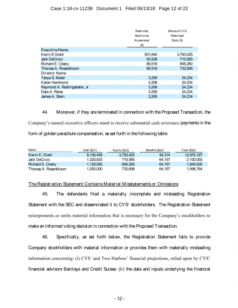 Case 1:18-cv-11238 Document 1 Filed 06/13/18 Page 12 of 22 Restricted Shares of CYS Stock to be Restricted Accelerated Stock ($) (#) Executive Name Kevin E Grant 501,840 3,793,425 Jack DeCicco 93,936 710,065 Richard E. Cleary 86,818 656,260 Thomas A. Rosenbloom 96,918 732,606 Director Name — Tanya S. Beder 3,206 24,234 Karen Hammond 3,206 24,234 Raymond A. Redlingshafer, Jr. 3,206 24,234 Dale A. Reiss 3,206 24,234 James A. Stern 3,206 24,234 44. Moreover, if they are terminated in connection with the Proposed Transaction, the Company’s named executive officers stand to receive substantial cash severance payments in the form of golden parachute compensation, as set forth in the following table: Name Cash ($)(1) Equity ($)(2) Benefits ($)(3) Total ($)(6) Kevin E. Grant 9,136,458 3,793,425 48,314 12,978,197 Jack DeCicco 1,325,833 710,065 64,157 2,100,055 Richard E. Cleary 1,129,083 656,260 64,157 1,849,500 Thomas A. Rosenbloom 1,200,000 732,606 64,157 1,996,764 The Registration Statement Contains Material Misstatements or Omissions 45. The defendants filed a materially incomplete and misleading Registration Statement with the SEC and disseminated it to CYS’ stockholders. The Registration Statement misrepresents or omits material information that is necessary for the Company’s stockholders to make an informed voting decision in connection with the Proposed Transaction. 46. Specifically, as set forth below, the Registration Statement fails to provide Company stockholders with material information or provides them with materially misleading information concerning: (i) CYS’ and Two Harbors’ financial projections, relied upon by CYS’ financial advisors Barclays and Credit Suisse; (ii) the data and inputs underlying the financial - 12 -