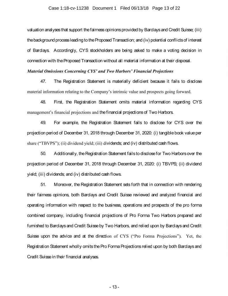 Case 1:18-cv-11238 Document 1 Filed 06/13/18 Page 13 of 22 valuation analyses that support the fairness opinions provided by Barclays and Credit Suisse; (iii) the background process leading to the Proposed Transaction; and (iv) potential conflicts of interest of Barclays. Accordingly, CYS stockholders are being asked to make a voting decision in connection with the Proposed Transaction without all material information at their disposal. Material Omissions Concerning CYS’ and Two Harbors’ Financial Projections 47. The Registration Statement is materially deficient because it fails to disclose material information relating to the Company’s intrinsic value and prospects going forward. 48. First, the Registration Statement omits material information regarding CYS management’s financial projections and the financial projections of Two Harbors. 49. For example, the Registration Statement fails to disclose for CYS over the projection period of December 31, 2018 through December 31, 2020: (i) tangible book value per share (“TBVPS”); (ii) dividend yield; (iii) dividends; and (iv) distributed cash flows. 50. Additionally, the Registration Statement fails to disclose for Two Harbors over the projection period of December 31, 2018 through December 31, 2020: (i) TBVPS; (ii) dividend yield; (iii) dividends; and (iv) distributed cash flows. 51. Moreover, the Registration Statement sets forth that in connection with rendering their fairness opinions, both Barclays and Credit Suisse reviewed and analyzed financial and operating information with respect to the business, operations and prospects of the pro forma combined company, including financial projections of Pro Forma Two Harbors prepared and furnished to Barclays and Credit Suisse by Two Harbors, and relied upon by Barclays and Credit Suisse upon the advice and at the direction of CYS (“Pro Forma Projections”). Yet, the Registration Statement wholly omits the Pro Forma Projections relied upon by both Barclays and Credit Suisse in their financial analyses. - 13 -