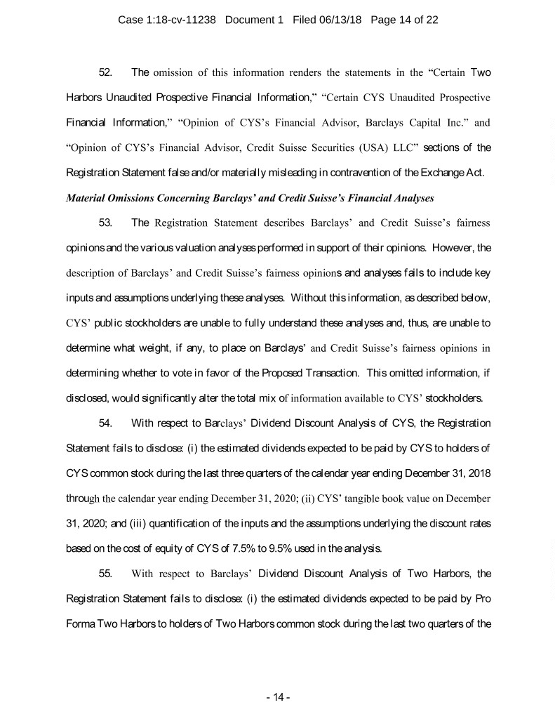 Case 1:18-cv-11238 Document 1 Filed 06/13/18 Page 14 of 22 52. The omission of this information renders the statements in the “Certain Two Harbors Unaudited Prospective Financial Information,” “Certain CYS Unaudited Prospective Financial Information,” “Opinion of CYS’s Financial Advisor, Barclays Capital Inc.” and “Opinion of CYS’s Financial Advisor, Credit Suisse Securities (USA) LLC” sections of the Registration Statement false and/or materially misleading in contravention of the Exchange Act. Material Omissions Concerning Barclays’ and Credit Suisse’s Financial Analyses 53. The Registration Statement describes Barclays’ and Credit Suisse’s fairness opinions and the various valuation analyses performed in support of their opinions. However, the description of Barclays’ and Credit Suisse’s fairness opinions and analyses fails to include key inputs and assumptions underlying these analyses. Without this information, as described below, CYS’ public stockholders are unable to fully understand these analyses and, thus, are unable to determine what weight, if any, to place on Barclays’ and Credit Suisse’s fairness opinions in determining whether to vote in favor of the Proposed Transaction. This omitted information, if disclosed, would significantly alter the total mix of information available to CYS’ stockholders. 54. With respect to Barclays’ Dividend Discount Analysis of CYS, the Registration Statement fails to disclose: (i) the estimated dividends expected to be paid by CYS to holders of CYS common stock during the last three quarters of the calendar year ending December 31, 2018 through the calendar year ending December 31, 2020; (ii) CYS’ tangible book value on December 31, 2020; and (iii) quantification of the inputs and the assumptions underlying the discount rates based on the cost of equity of CYS of 7.5% to 9.5% used in the analysis. 55. With respect to Barclays’ Dividend Discount Analysis of Two Harbors, the Registration Statement fails to disclose: (i) the estimated dividends expected to be paid by Pro Forma Two Harbors to holders of Two Harbors common stock during the last two quarters of the - 14 -