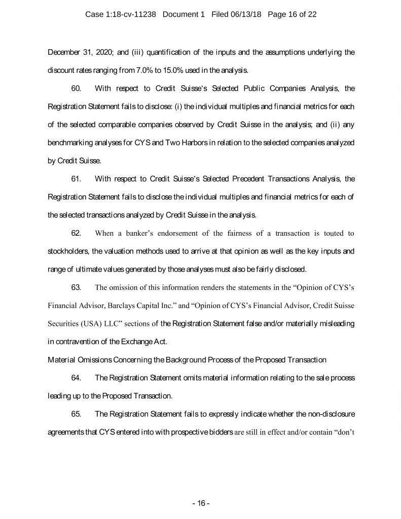 Case 1:18-cv-11238 Document 1 Filed 06/13/18 Page 16 of 22 December 31, 2020; and (iii) quantification of the inputs and the assumptions underlying the discount rates ranging from 7.0% to 15.0% used in the analysis. 60. With respect to Credit Suisse’s Selected Public Companies Analysis, the Registration Statement fails to disclose: (i) the individual multiples and financial metrics for each of the selected comparable companies observed by Credit Suisse in the analysis; and (ii) any benchmarking analyses for CYS and Two Harbors in relation to the selected companies analyzed by Credit Suisse. 61. With respect to Credit Suisse’s Selected Precedent Transactions Analysis, the Registration Statement fails to disclose the individual multiples and financial metrics for each of the selected transactions analyzed by Credit Suisse in the analysis. 62. When a banker’s endorsement of the fairness of a transaction is touted to stockholders, the valuation methods used to arrive at that opinion as well as the key inputs and range of ultimate values generated by those analyses must also be fairly disclosed. 63. The omission of this information renders the statements in the “Opinion of CYS’s Financial Advisor, Barclays Capital Inc.” and “Opinion of CYS’s Financial Advisor, Credit Suisse Securities (USA) LLC” sections of the Registration Statement false and/or materially misleading in contravention of the Exchange Act. Material Omissions Concerning the Background Process of the Proposed Transaction 64. The Registration Statement omits material information relating to the sale process leading up to the Proposed Transaction. 65. The Registration Statement fails to expressly indicate whether the non-disclosure agreements that CYS entered into with prospective bidders are still in effect and/or contain “don’t - 16 -