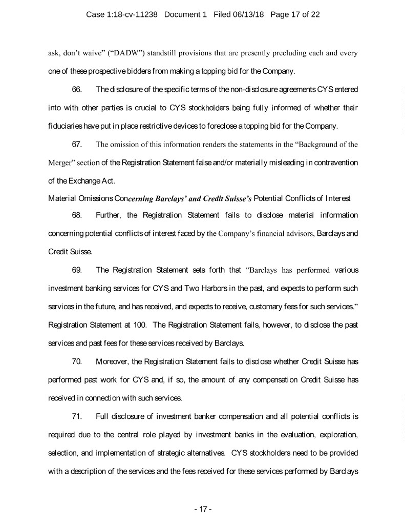 Case 1:18-cv-11238 Document 1 Filed 06/13/18 Page 17 of 22 ask, don’t waive” (“DADW”) standstill provisions that are presently precluding each and every one of these prospective bidders from making a topping bid for the Company. 66. The disclosure of the specific terms of the non-disclosure agreements CYS entered into with other parties is crucial to CYS stockholders being fully informed of whether their fiduciaries have put in place restrictive devices to foreclose a topping bid for the Company. 67. The omission of this information renders the statements in the “Background of the Merger” section of the Registration Statement false and/or materially misleading in contravention of the Exchange Act. Material Omissions Concerning Barclays’ and Credit Suisse’s Potential Conflicts of Interest 68. Further, the Registration Statement fails to disclose material information concerning potential conflicts of interest faced by the Company’s financial advisors, Barclays and Credit Suisse. 69. The Registration Statement sets forth that “Barclays has performed various investment banking services for CYS and Two Harbors in the past, and expects to perform such services in the future, and has received, and expects to receive, customary fees for such services.” Registration Statement at 100. The Registration Statement fails, however, to disclose the past services and past fees for these services received by Barclays. 70. Moreover, the Registration Statement fails to disclose whether Credit Suisse has performed past work for CYS and, if so, the amount of any compensation Credit Suisse has received in connection with such services. 71. Full disclosure of investment banker compensation and all potential conflicts is required due to the central role played by investment banks in the evaluation, exploration, selection, and implementation of strategic alternatives. CYS stockholders need to be provided with a description of the services and the fees received for these services performed by Barclays - 17 -