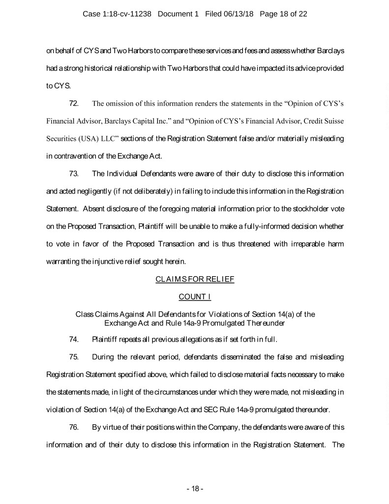 Case 1:18-cv-11238 Document 1 Filed 06/13/18 Page 18 of 22 on behalf of CYS and Two Harbors to compare these services and fees and assess whether Barclays had a strong historical relationship with Two Harbors that could have impacted its advice provided to CYS. 72. The omission of this information renders the statements in the “Opinion of CYS’s Financial Advisor, Barclays Capital Inc.” and “Opinion of CYS’s Financial Advisor, Credit Suisse Securities (USA) LLC” sections of the Registration Statement false and/or materially misleading in contravention of the Exchange Act. 73. The Individual Defendants were aware of their duty to disclose this information and acted negligently (if not deliberately) in failing to include this information in the Registration Statement. Absent disclosure of the foregoing material information prior to the stockholder vote on the Proposed Transaction, Plaintiff will be unable to make a fully-informed decision whether to vote in favor of the Proposed Transaction and is thus threatened with irreparable harm warranting the injunctive relief sought herein. CLAIMS FOR RELIEF COUNT I Class Claims Against All Defendants for Violations of Section 14(a) of the Exchange Act and Rule 14a-9 Promulgated Thereunder 74. Plaintiff repeats all previous allegations as if set forth in full. 75. During the relevant period, defendants disseminated the false and misleading Registration Statement specified above, which failed to disclose material facts necessary to make the statements made, in light of the circumstances under which they were made, not misleading in violation of Section 14(a) of the Exchange Act and SEC Rule 14a-9 promulgated thereunder. 76. By virtue of their positions within the Company, the defendants were aware of this information and of their duty to disclose this information in the Registration Statement. The - 18 -