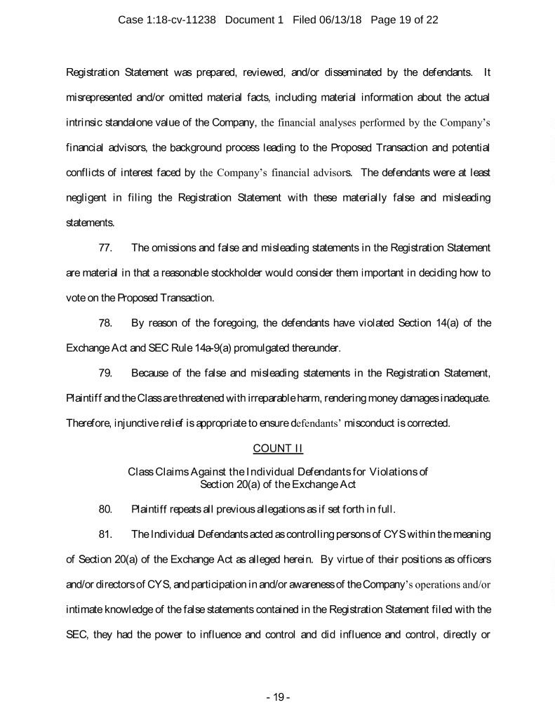 Case 1:18-cv-11238 Document 1 Filed 06/13/18 Page 19 of 22 Registration Statement was prepared, reviewed, and/or disseminated by the defendants. It misrepresented and/or omitted material facts, including material information about the actual intrinsic standalone value of the Company, the financial analyses performed by the Company’s financial advisors, the background process leading to the Proposed Transaction and potential conflicts of interest faced by the Company’s financial advisors. The defendants were at least negligent in filing the Registration Statement with these materially false and misleading statements. 77. The omissions and false and misleading statements in the Registration Statement are material in that a reasonable stockholder would consider them important in deciding how to vote on the Proposed Transaction. 78. By reason of the foregoing, the defendants have violated Section 14(a) of the Exchange Act and SEC Rule 14a-9(a) promulgated thereunder. 79. Because of the false and misleading statements in the Registration Statement, Plaintiff and the Class are threatened with irreparable harm, rendering money damages inadequate. Therefore, injunctive relief is appropriate to ensure defendants’ misconduct is corrected. COUNT II Class Claims Against the Individual Defendants for Violations of Section 20(a) of the Exchange Act 80. Plaintiff repeats all previous allegations as if set forth in full. 81. The Individual Defendants acted as controlling persons of CYS within the meaning of Section 20(a) of the Exchange Act as alleged herein. By virtue of their positions as officers and/or directors of CYS, and participation in and/or awareness of the Company’s operations and/or intimate knowledge of the false statements contained in the Registration Statement filed with the SEC, they had the power to influence and control and did influence and control, directly or - 19 -