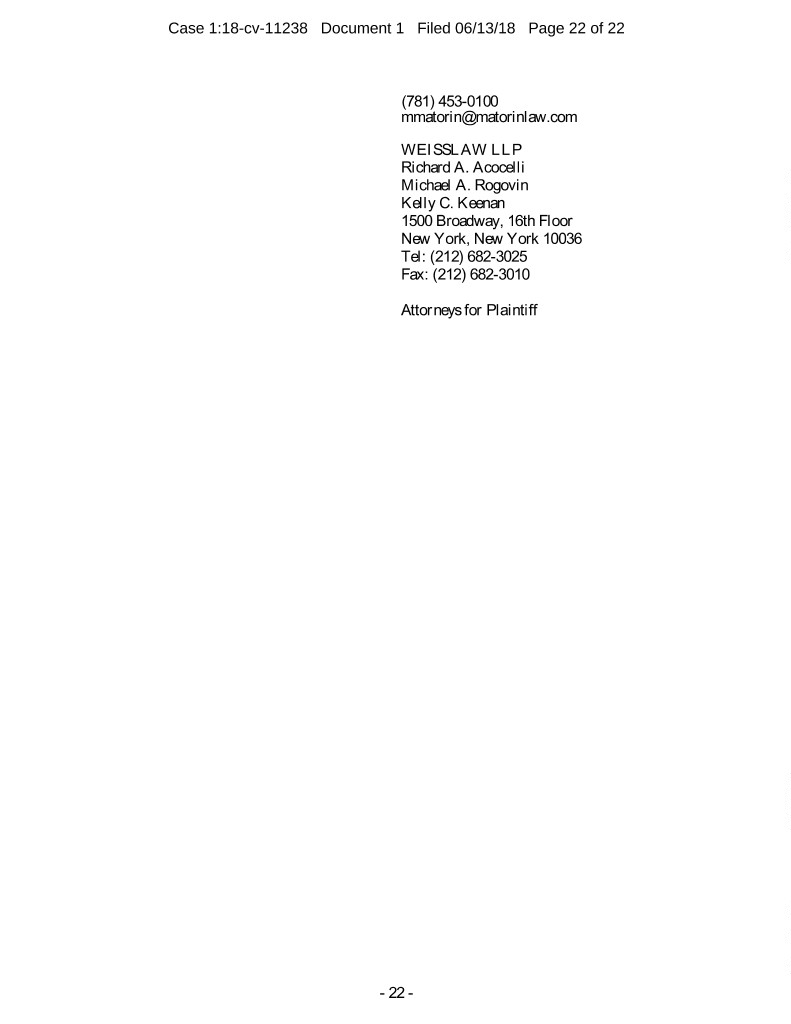Case 1:18-cv-11238 Document 1 Filed 06/13/18 Page 22 of 22 (781) 453-0100 mmatorin@matorinlaw.com WEISSLAW LLP Richard A. Acocelli Michael A. Rogovin Kelly C. Keenan 1500 Broadway, 16th Floor New York, New York 10036 Tel: (212) 682-3025 Fax: (212) 682-3010 Attorneys for Plaintiff - 22 -