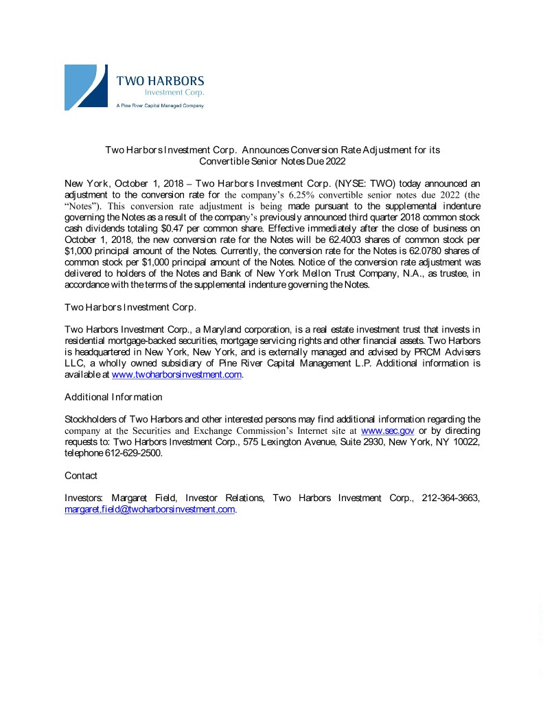 Two Harbors Investment Corp. Announces Conversion Rate Adjustment for its Convertible Senior Notes Due 2022 New York, October 1, 2018 – Two Harbors Investment Corp. (NYSE: TWO) today announced an adjustment to the conversion rate for the company’s 6.25% convertible senior notes due 2022 (the “Notes”). This conversion rate adjustment is being made pursuant to the supplemental indenture governing the Notes as a result of the company’s previously announced third quarter 2018 common stock cash dividends totaling $0.47 per common share. Effective immediately after the close of business on October 1, 2018, the new conversion rate for the Notes will be 62.4003 shares of common stock per $1,000 principal amount of the Notes. Currently, the conversion rate for the Notes is 62.0780 shares of common stock per $1,000 principal amount of the Notes. Notice of the conversion rate adjustment was delivered to holders of the Notes and Bank of New York Mellon Trust Company, N.A., as trustee, in accordance with the terms of the supplemental indenture governing the Notes. Two Harbors Investment Corp. Two Harbors Investment Corp., a Maryland corporation, is a real estate investment trust that invests in residential mortgage-backed securities, mortgage servicing rights and other financial assets. Two Harbors is headquartered in New York, New York, and is externally managed and advised by PRCM Advisers LLC, a wholly owned subsidiary of Pine River Capital Management L.P. Additional information is available at www.twoharborsinvestment.com. Additional Information Stockholders of Two Harbors and other interested persons may find additional information regarding the company at the Securities and Exchange Commission’s Internet site at www.sec.gov or by directing requests to: Two Harbors Investment Corp., 575 Lexington Avenue, Suite 2930, New York, NY 10022, telephone 612-629-2500. Contact Investors: Margaret Field, Investor Relations, Two Harbors Investment Corp., 212-364-3663, margaret.field@twoharborsinvestment.com.