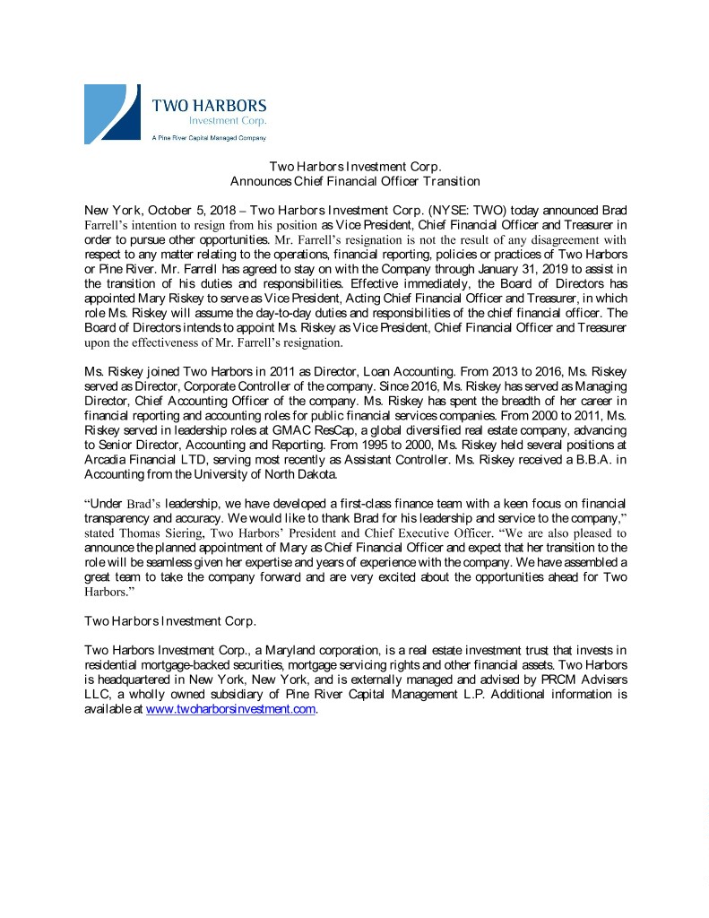 Two Harbors Investment Corp. Announces Chief Financial Officer Transition New York, October 5, 2018 – Two Harbors Investment Corp. (NYSE: TWO) today announced Brad Farrell’s intention to resign from his position as Vice President, Chief Financial Officer and Treasurer in order to pursue other opportunities. Mr. Farrell’s resignation is not the result of any disagreement with respect to any matter relating to the operations, financial reporting, policies or practices of Two Harbors or Pine River. Mr. Farrell has agreed to stay on with the Company through January 31, 2019 to assist in the transition of his duties and responsibilities. Effective immediately, the Board of Directors has appointed Mary Riskey to serve as Vice President, Acting Chief Financial Officer and Treasurer, in which role Ms. Riskey will assume the day-to-day duties and responsibilities of the chief financial officer. The Board of Directors intends to appoint Ms. Riskey as Vice President, Chief Financial Officer and Treasurer upon the effectiveness of Mr. Farrell’s resignation. Ms. Riskey joined Two Harbors in 2011 as Director, Loan Accounting. From 2013 to 2016, Ms. Riskey served as Director, Corporate Controller of the company. Since 2016, Ms. Riskey has served as Managing Director, Chief Accounting Officer of the company. Ms. Riskey has spent the breadth of her career in financial reporting and accounting roles for public financial services companies. From 2000 to 2011, Ms. Riskey served in leadership roles at GMAC ResCap, a global diversified real estate company, advancing to Senior Director, Accounting and Reporting. From 1995 to 2000, Ms. Riskey held several positions at Arcadia Financial LTD, serving most recently as Assistant Controller. Ms. Riskey received a B.B.A. in Accounting from the University of North Dakota. “Under Brad’s leadership, we have developed a first-class finance team with a keen focus on financial transparency and accuracy. We would like to thank Brad for his leadership and service to the company,” stated Thomas Siering, Two Harbors’ President and Chief Executive Officer. “We are also pleased to announce the planned appointment of Mary as Chief Financial Officer and expect that her transition to the role will be seamless given her expertise and years of experience with the company. We have assembled a great team to take the company forward and are very excited about the opportunities ahead for Two Harbors.” Two Harbors Investment Corp. Two Harbors Investment Corp., a Maryland corporation, is a real estate investment trust that invests in residential mortgage-backed securities, mortgage servicing rights and other financial assets. Two Harbors is headquartered in New York, New York, and is externally managed and advised by PRCM Advisers LLC, a wholly owned subsidiary of Pine River Capital Management L.P. Additional information is available at www.twoharborsinvestment.com.